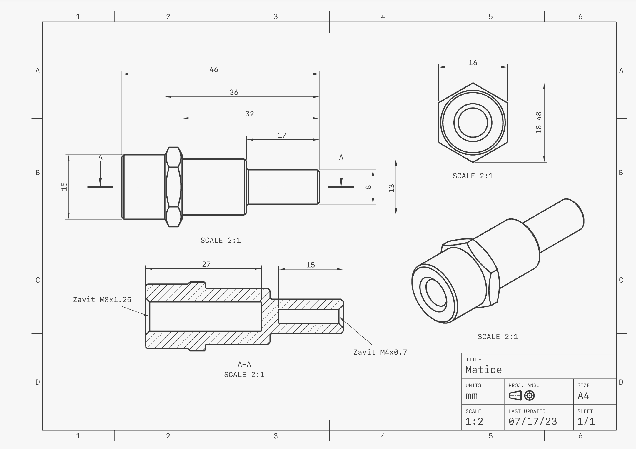 Je to matice z kliky ramene studioveho svetla. Šestihran musí pasovat do hvězdice, která umožňuje změnu úhlu kliky. Klika jako taková je pěkná, litá z kovu, jen ta matice je moc měkká a závit se strhnul. Nejsem strojař ani inženýr, tak vám můj výkres a zadání možná přijdou úsměvné, ale dělal jsem co...