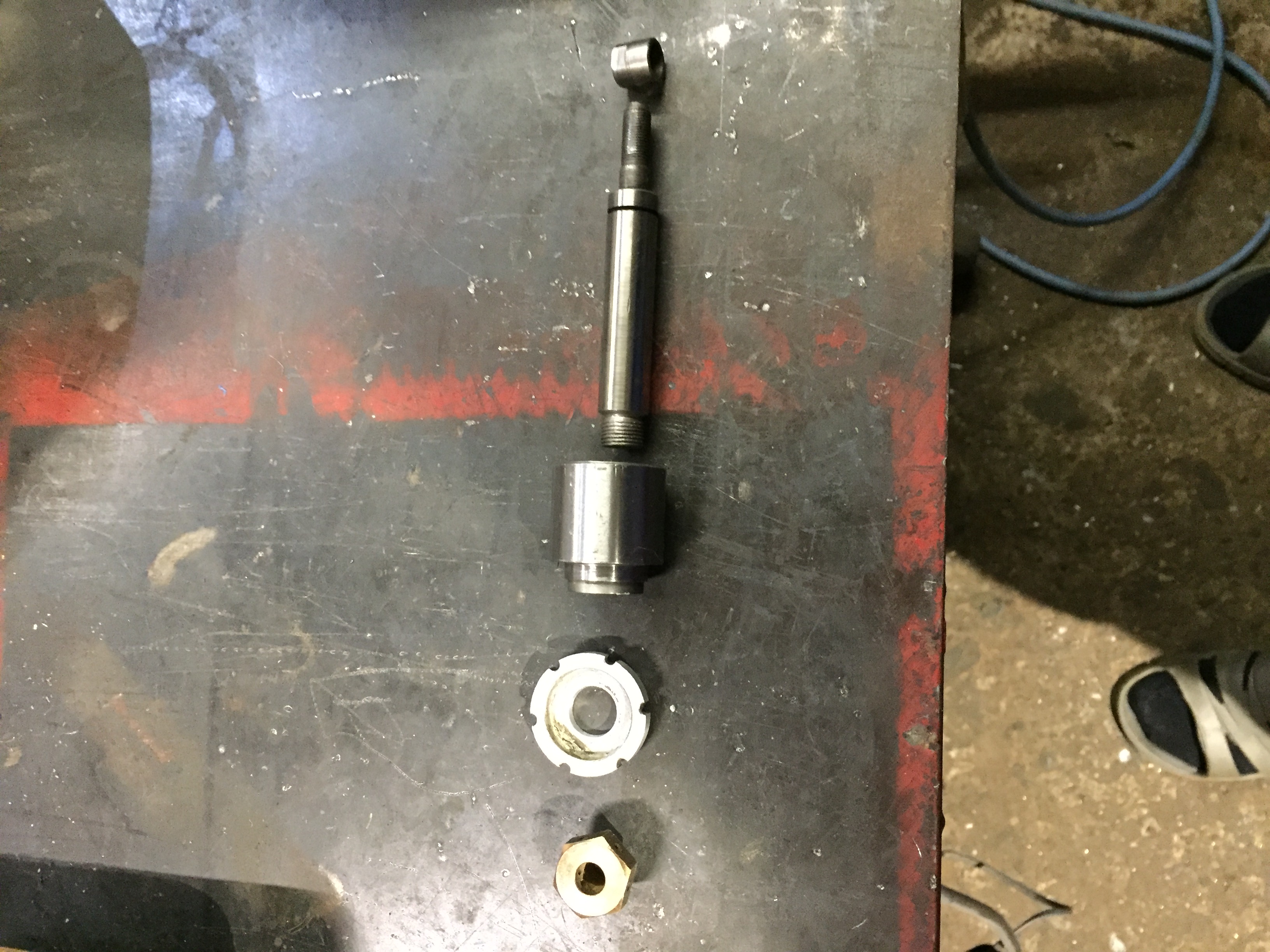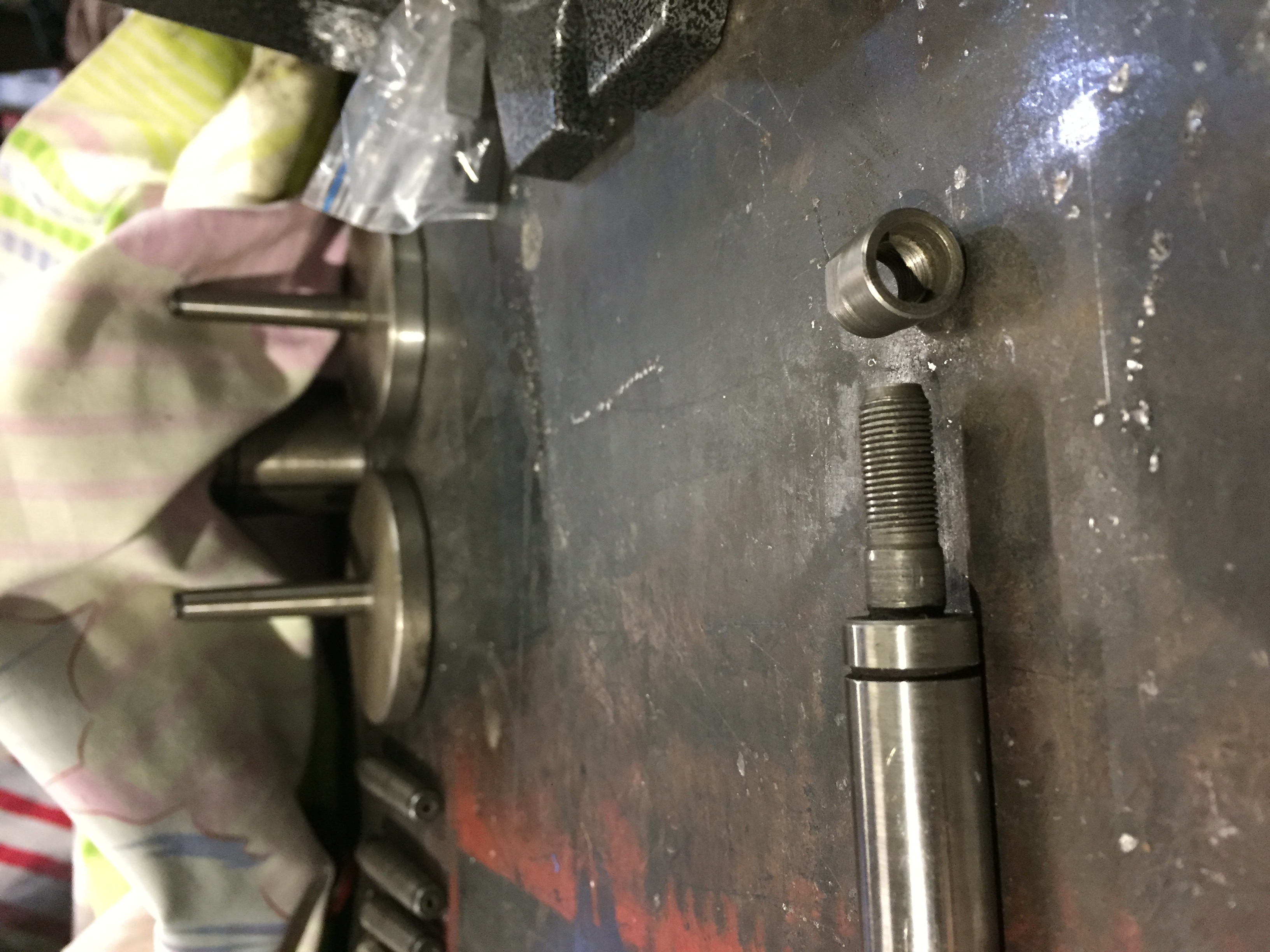 Třetí fotka - nad maznicí jsou dvě MN 814 - ploché vrtací desky, nad tím ložisko vřetene, vedle vlevo soustružnické hroty a úplně vlevo(ten poslední) je MN 806 - vrtací deska pro kulaté předměty. pod nim je polovina matky posuvu suportu.
