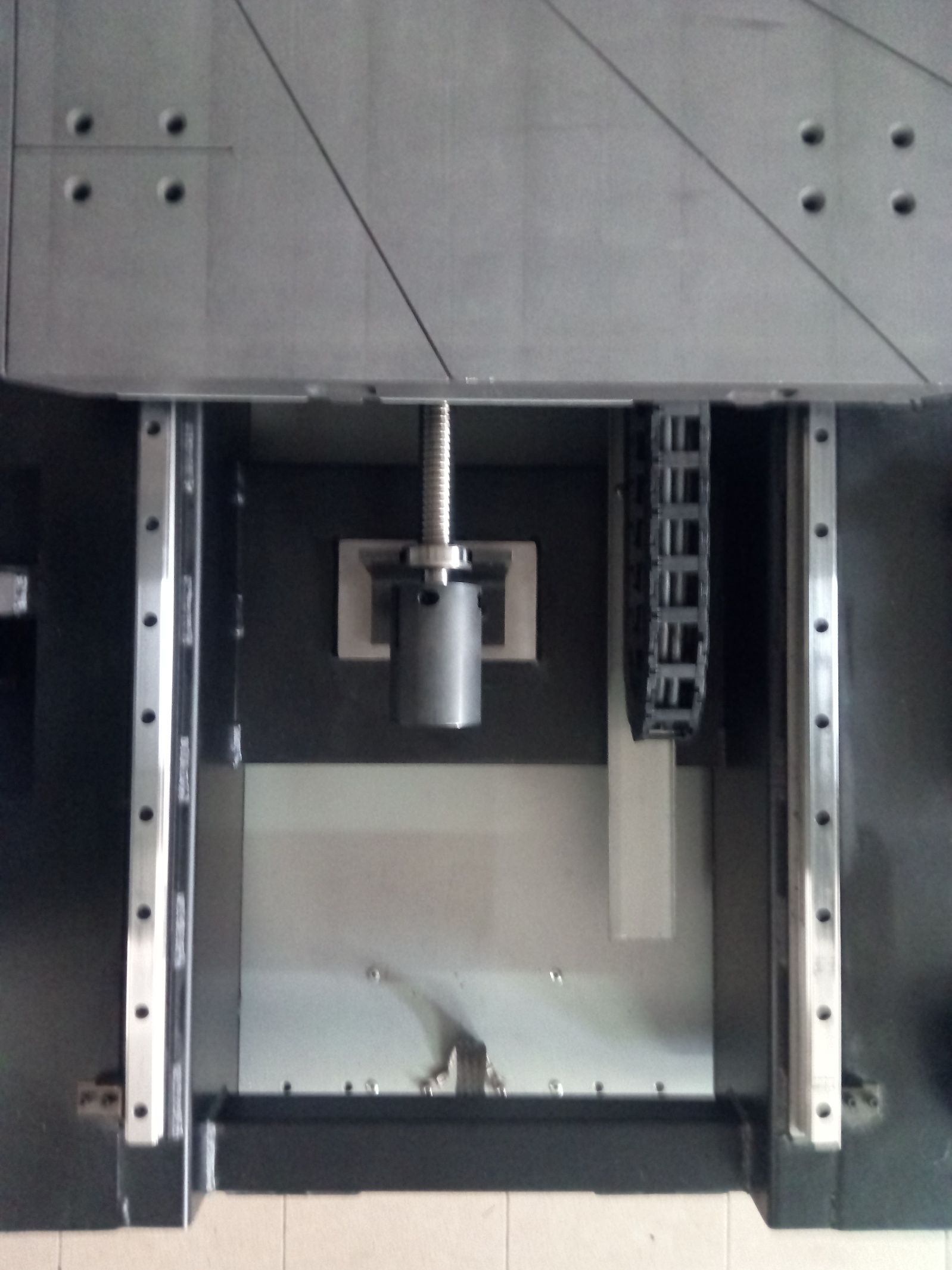 Včera jsem to dotáhnul do garáže a odstrojil plechy a pro mě nepoužitelnou elektroniku. Zbyl profi nýtovyný podstavec se spoustou místa pro elektroniku, svařený rám s dostatečnou tuhostí, zafrézované a seřízené lineáry (20mm), kuličkový šroub 25mm (slabý 5ti fázový krokový motor) a perfektní (zatím vakouvý) stůl o rozměrech 750x575mm. Vše profesionálně vyrobeno a seřízeno - tyto stroje mají výrobní tolerance +/- 20um kvůli zaostření laserového paprsku po stole.