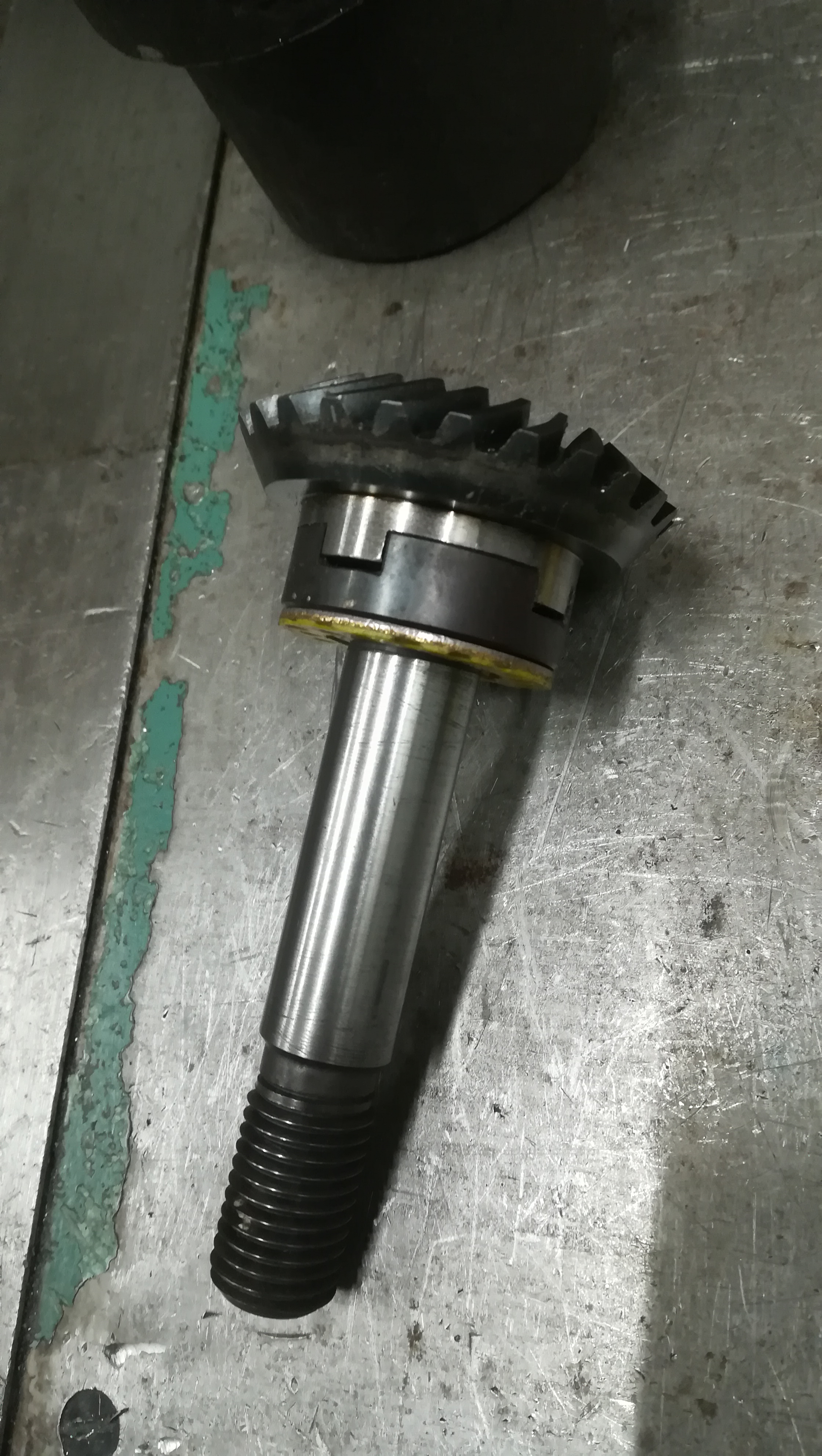 Dodělal jsem, no jak to nazvat, držák trnu úhlové hlavy aby fungovala. Nechtěl jsem do těla fenky vrtat, tak jsem využil kolíček co byl asi na uchycení chlazení zleva na trámci, vyndal ho, byl jen nalisovaný, udělal závit a napasoval na něj.