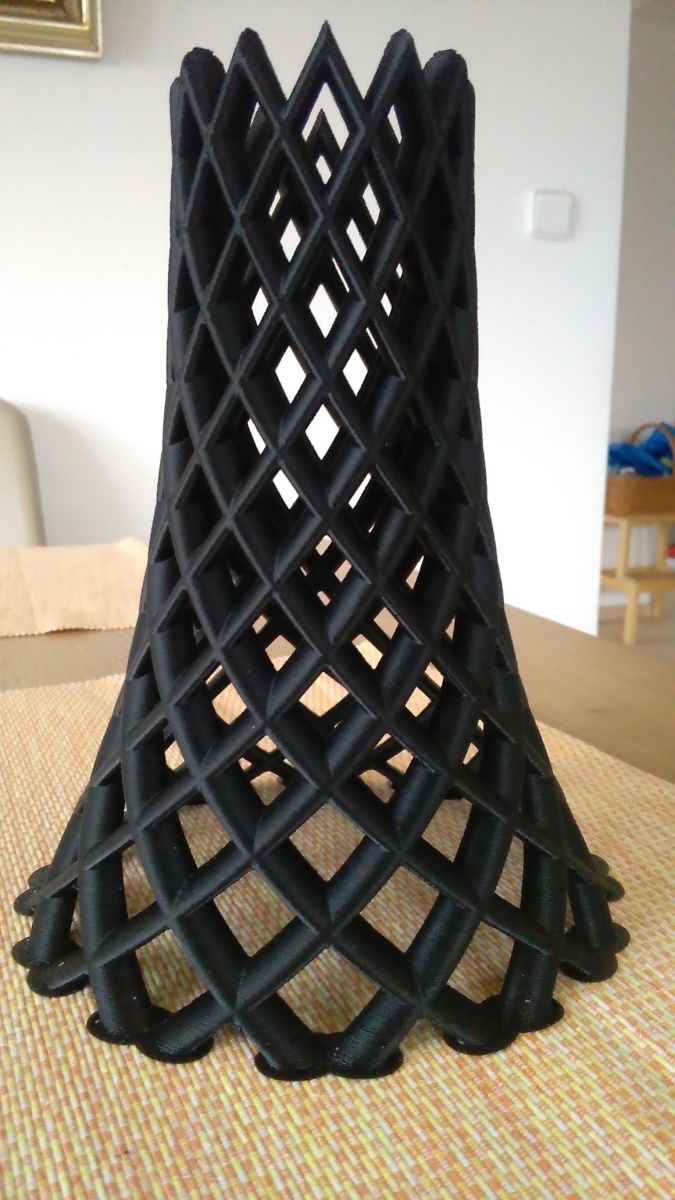 výška 185 mm, G-kod asi 90 MB, doba tisku 16 hodin, na omak povrch překvapivě dobrý.