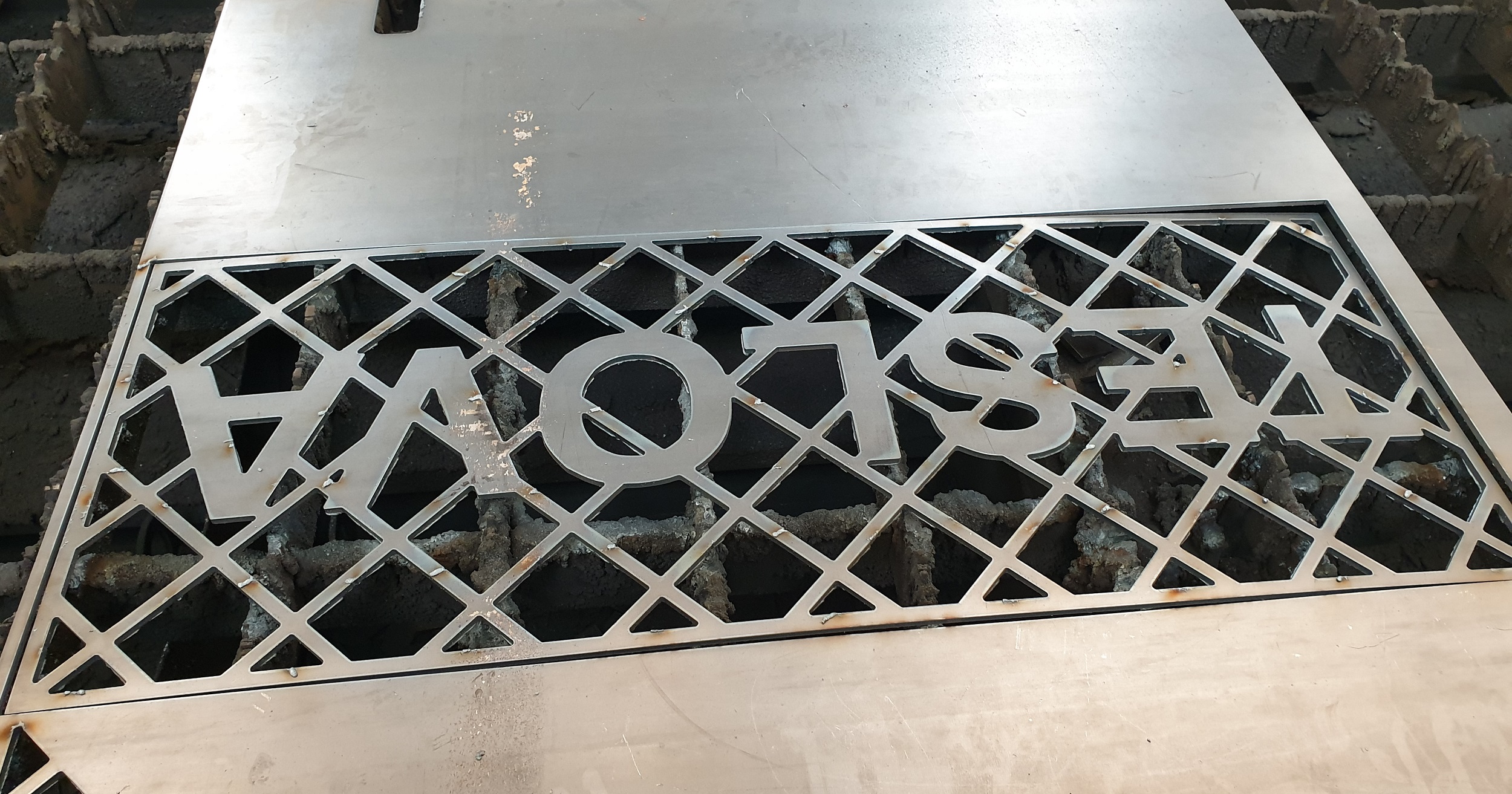 Pravidelne sa nám snažia v bytovke vykrádať garáž, vetracie otvory majú len takú ozdobnú hliníkovú lamelovú "mrežu" čo sa dá rukou vytrhať, tak som na plazme vypálil z 5-ky plechu tematickú mrežu, skereslené vo Fusion 360 (podľa názvu ulice), snáď to vydrží.