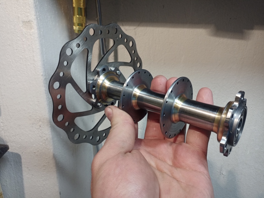 Keď nerátam spojovací materiál, ložiská a kotúč, tak je to zložené zo 7 častí (nemal som vhodne veľké kúsky materiálu). Pájkované mosadzou. Vyrobené celé na sústruhu (+ nejaké ručné náradie), 16 (a 6) dier po obvode som delil podľa ozubeného kolesa na vretene, vŕtal ručnou vŕtačkou uchytenou na suporte. Priemery a čelá pre kotúč a rozetu boli vytočené medzi hrotmi cez už nalisované ložiská.