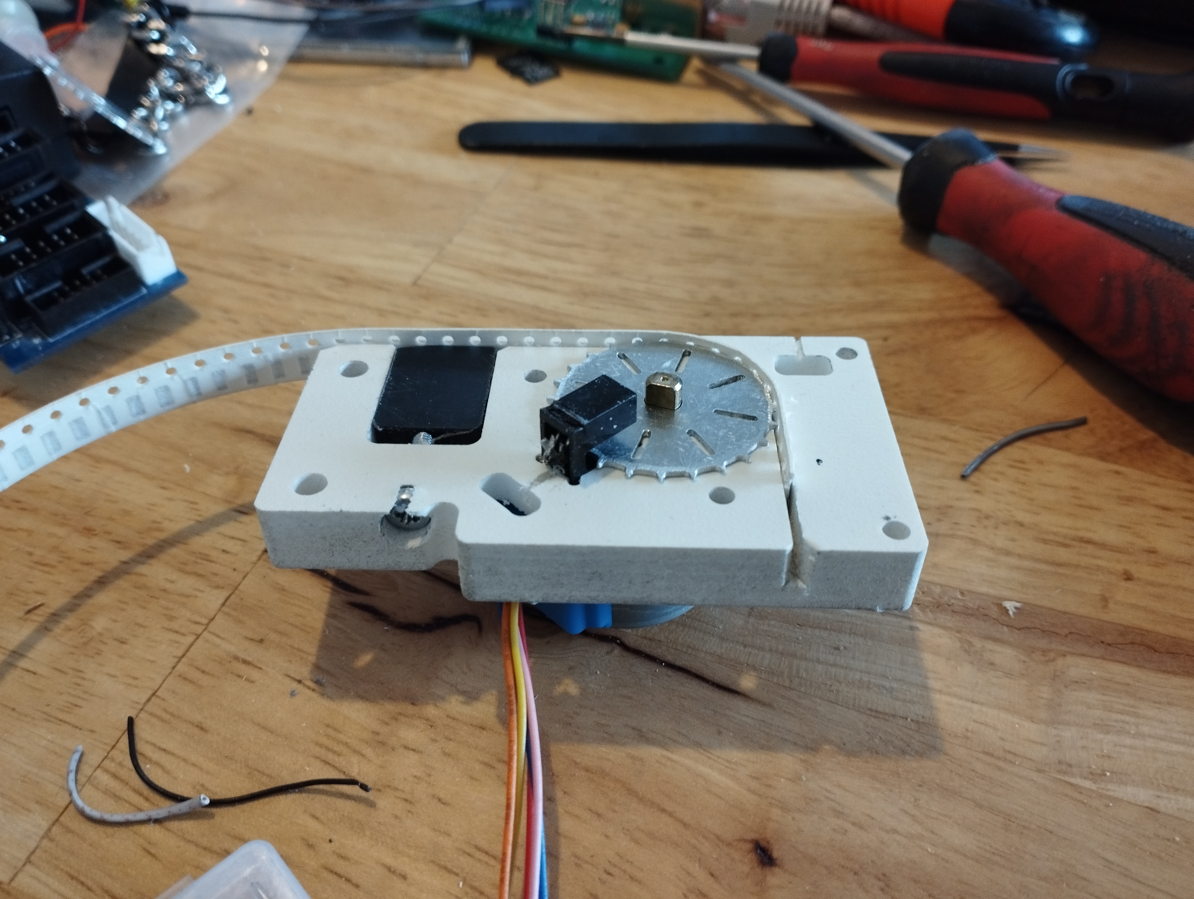 Krokovy motor ma nesympaticky prevodovy pomer 2037,8864197531 krokov na otacku, preto je tam ten opticky snimac polohy