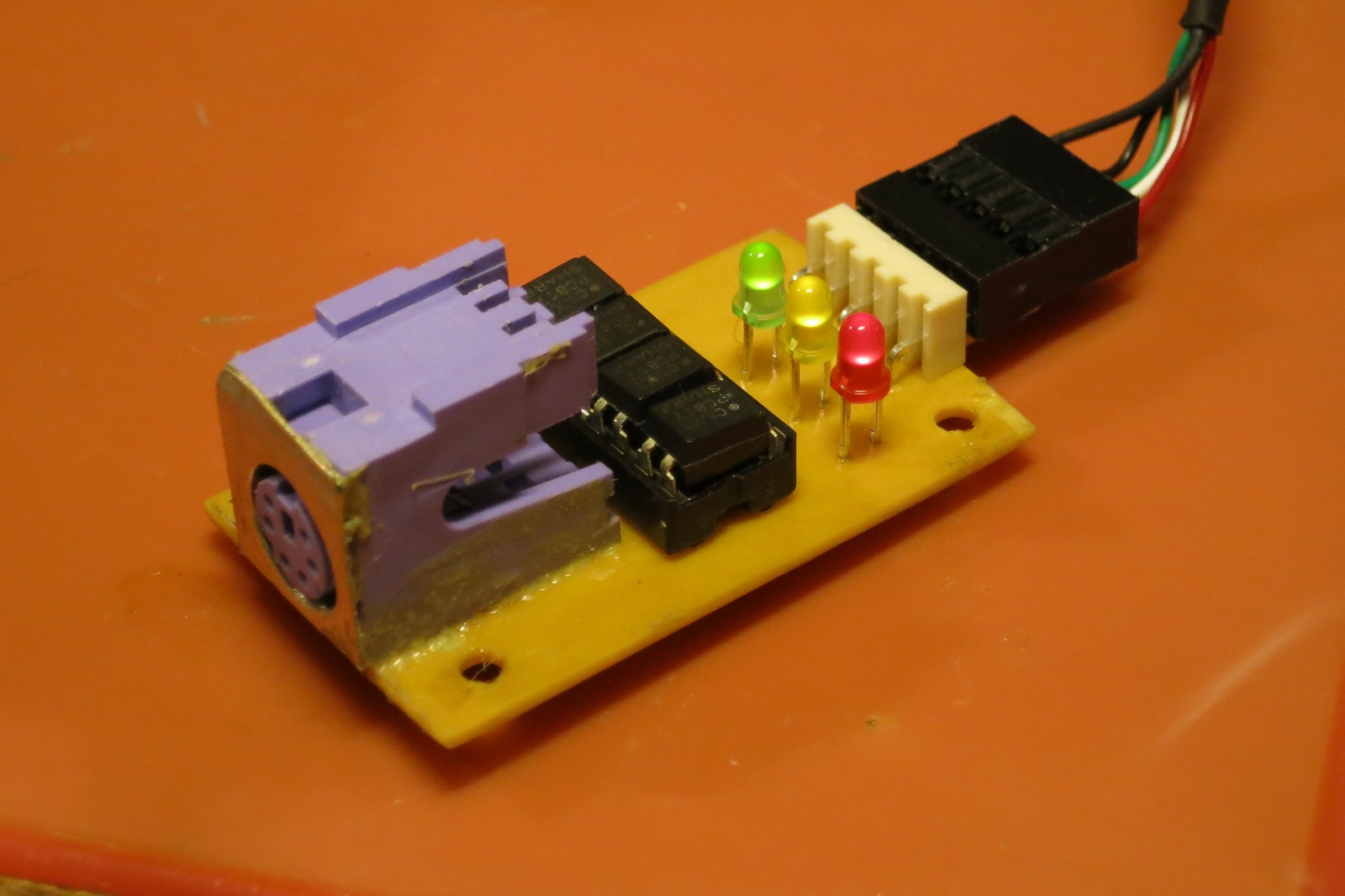 Při návrhu PCB se mi malinko popletlo číslování pinů u mini-DIN konektoru, ze šesti spojů jsem trefil rovných nula spojů, tak jsem to musel takto zalátat