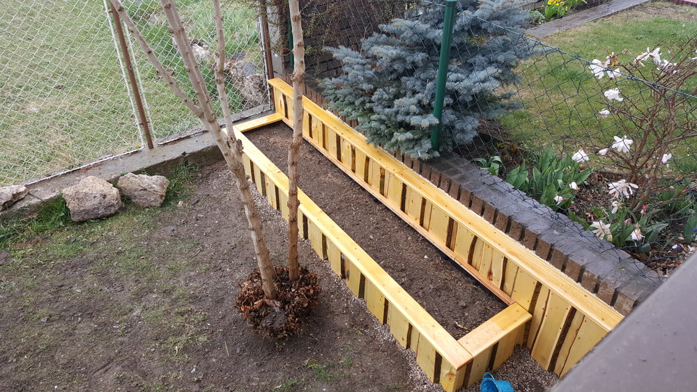 Vyvýšený záhon z palivového dreva(osika, jaseň, ...) bolo mi ho lúto v zime narúbať, tak som si z neho narezal dosky. Parapety sú z modřínu... zase + bod u ženy ... ešte 99 a snad mnĕ pustí na pivo ...