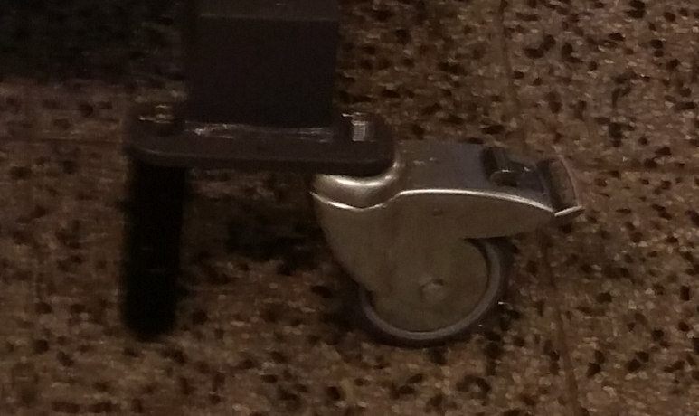 Mám tam zároveň kolečko i nožičku. Ta je v půli šroubovací // ta fotka je mizerná // a když je mašina na místě, vytočím spodní díl nožičky a kolečko se ocitne ve vzduchu. Mašinu tím vyvážím. Zároveň je to pojistka, kdyby kolečko prdlo, tak si to kecne na tu nožičku.