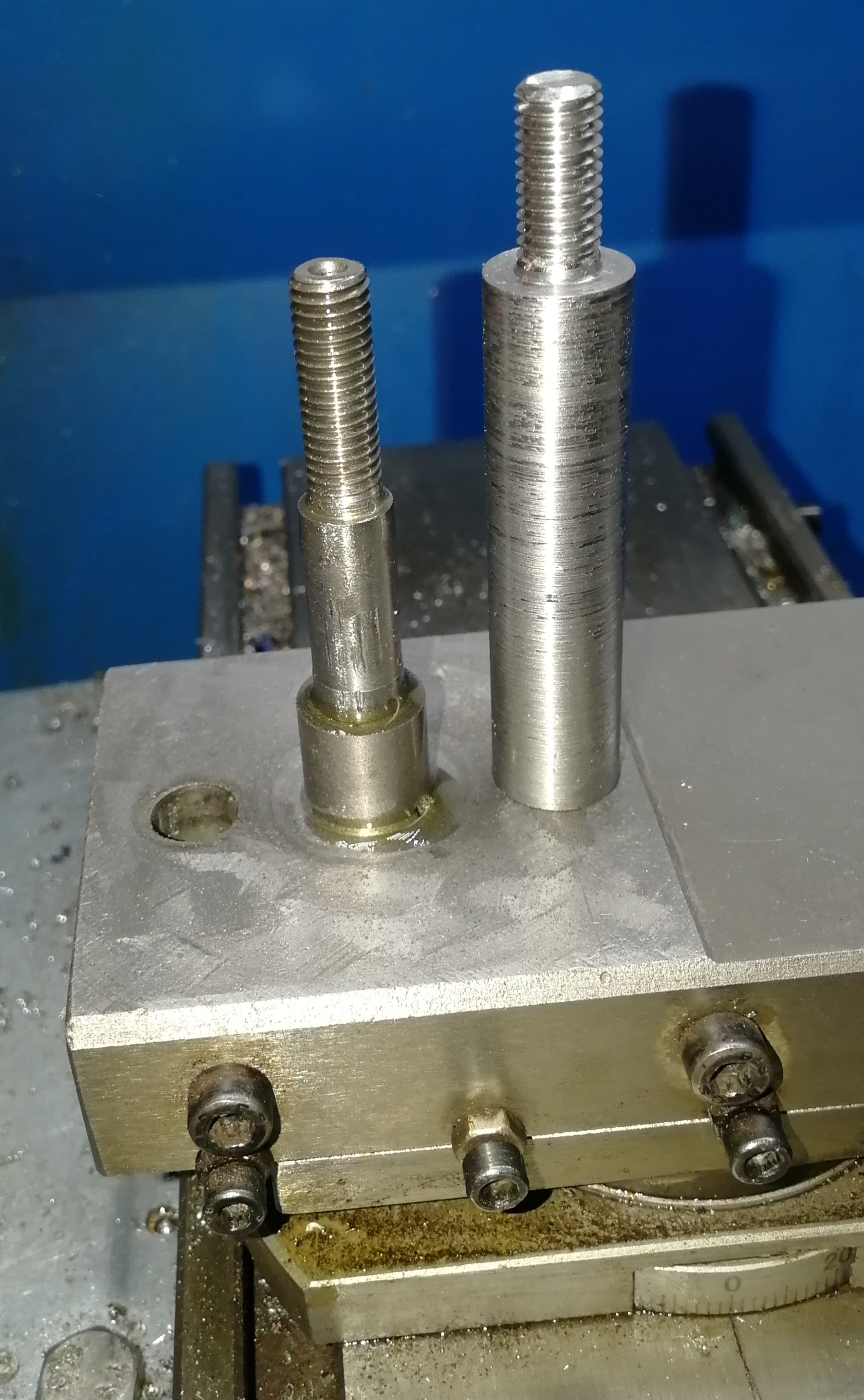 Skrutku som nechal povodnu, nemalo zmysel vyravbat novu dlhsiu, aj tak by mala priemer 10mm, a diera v upinaci bola 14,4mm. Keby som to robil znova upnem tu skrutku z upinaca a preliznem po dlzke na 14,5mm aby to pekne sedelo.