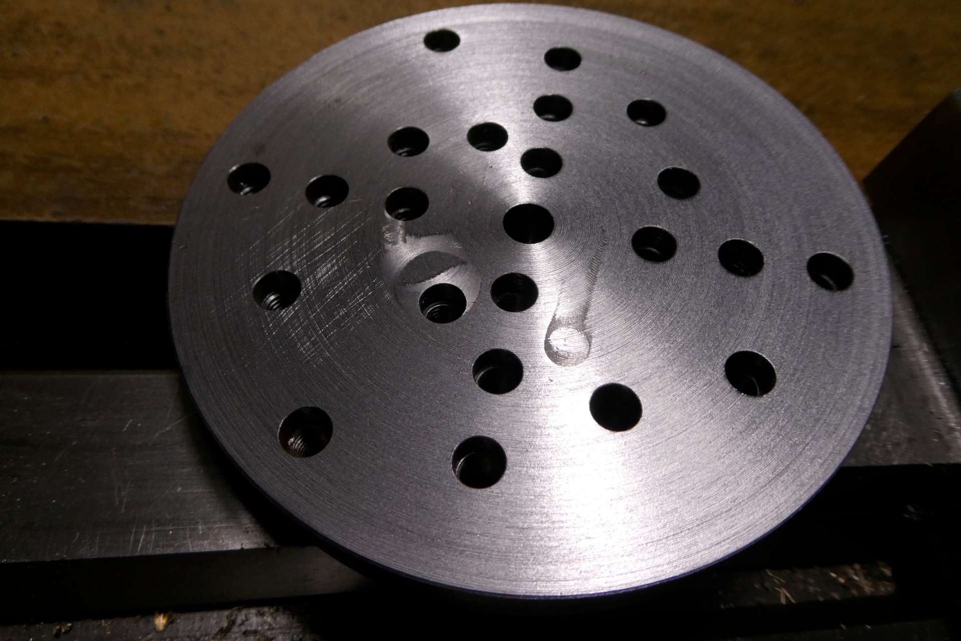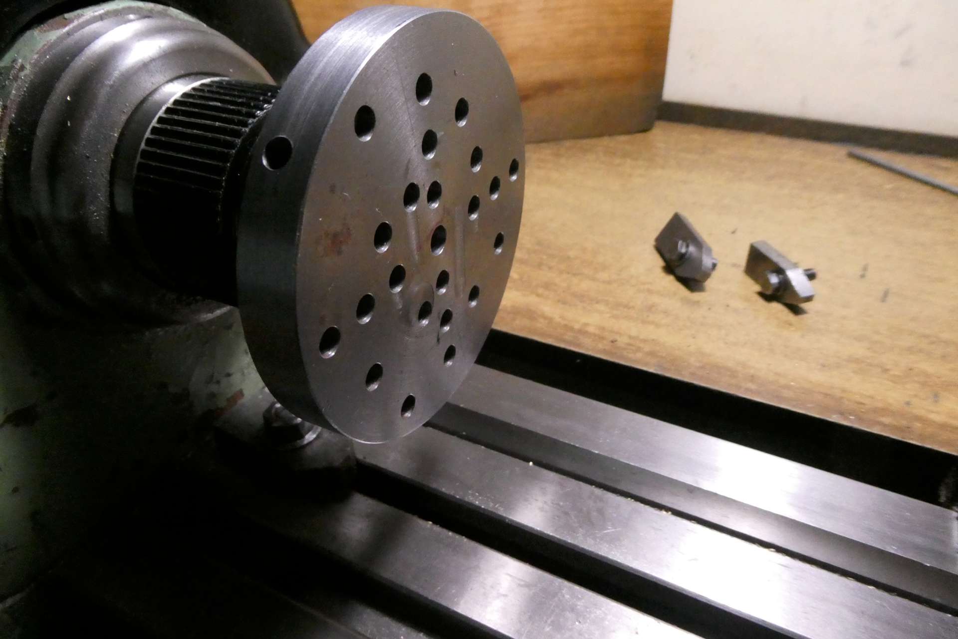 Pro uživatele posílám obrázky mé často používané pomůcky, sloužící k obrábění nepravidelných obrobků. Je to upínací lícní deska s kleštinovým trnem. Používám ji jak do vřetene, tak do děličky. Obrobky se upínají příložkami, lze je orientovat co do vzdálenosti od středu i pomocí trnů do děr. Díry mají v přední části průměr 6 mm a v zadní části závit M5. Vrtány jsou na přesných roztečných kružnicích, v různém počtu. Po obvodu jsou navrtány 4 díry k zasunutí manipulačního kolíku pro ruční natáčení v děličce.