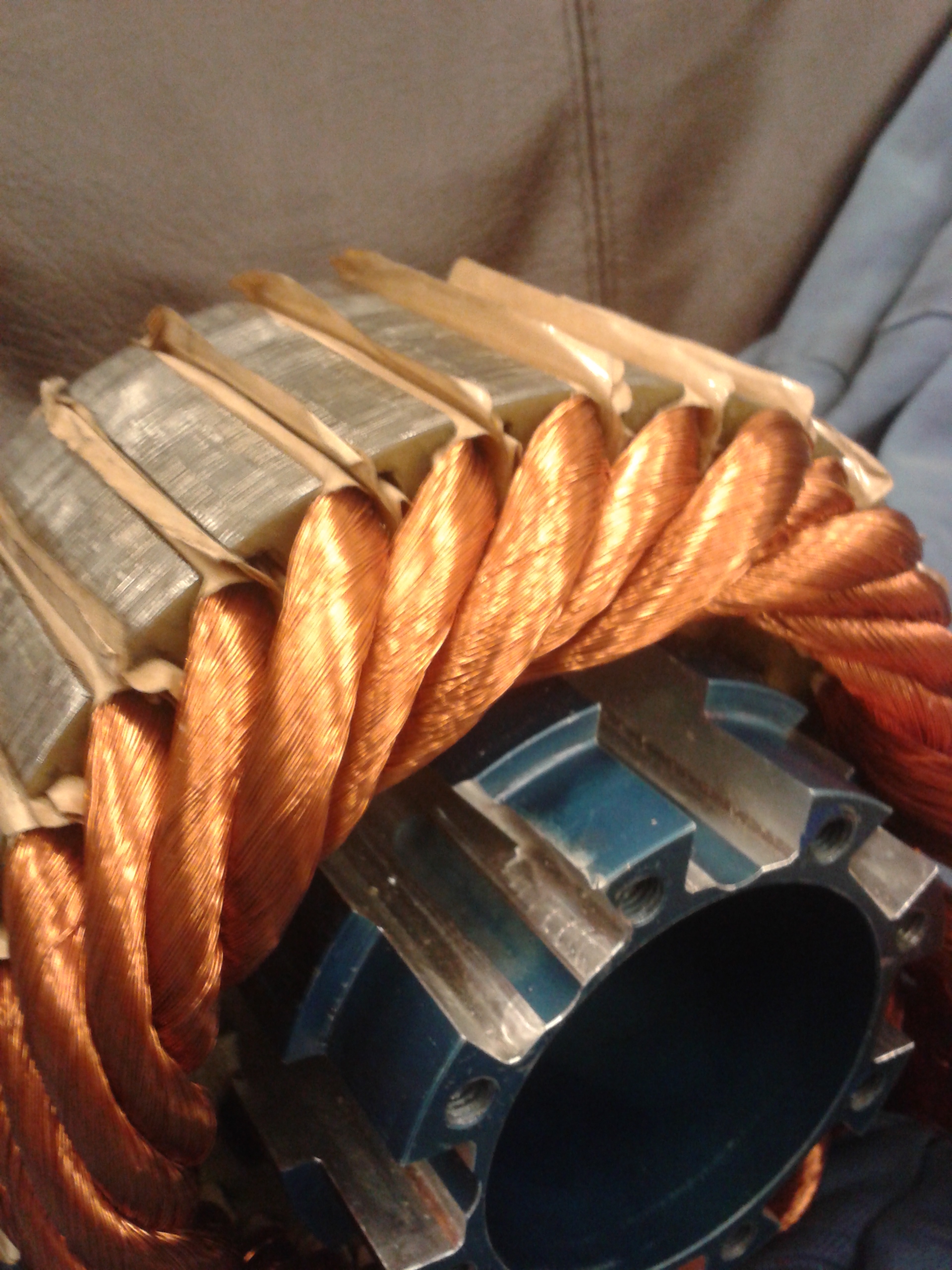 Jedna z největších pakáren co jsem asi kdy navíjel.Svazek drátů 0.3 mm 400ks na fázi , 1 závit. Je to pokus do 2CV pro nějakýho švýcara , max výkon cca 25Kw, 6000 otáček. Uvidím jak se to vejde pod zadní čelo , pokud ne tak 5 hodin navijení v háji.