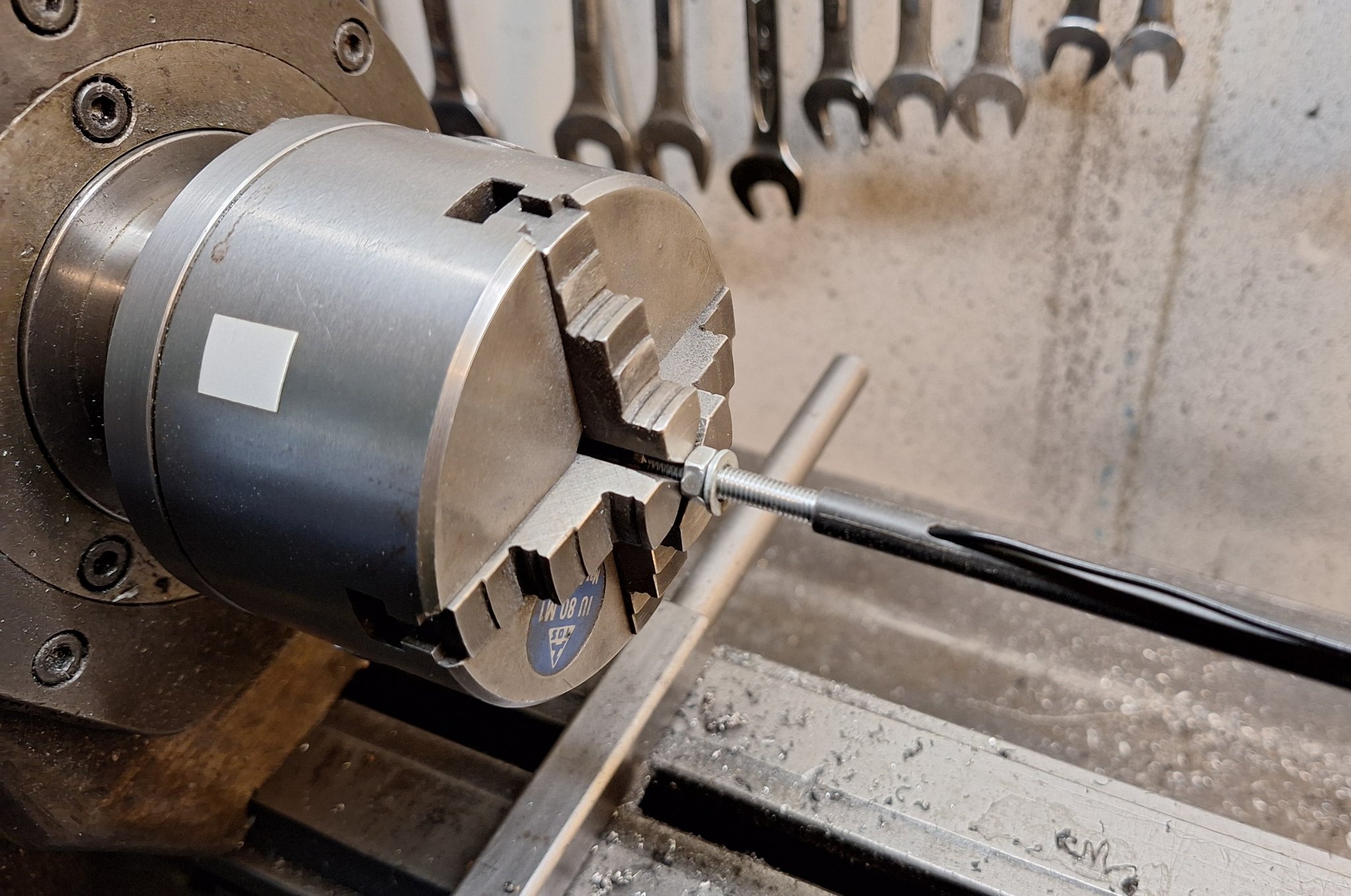 Odvrtáni a vytočeni zbytku závitových tyčí M16 Poté převratání 4 otvorů na 17,5 a poté vyříznutí závitu M20 na spodku hnětače Víc jak M20 nešlo udělat kvůli uvnitř navazujícímu prostupu otvoru v konstrukci stroje