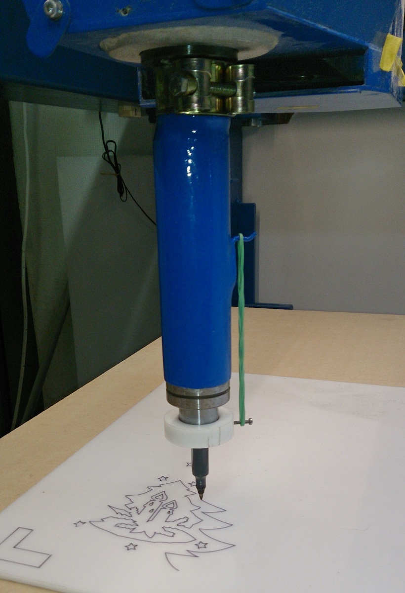 V laminatovym pouzdru jsou dve linearni loziska 20mm a v nich duta brousena tyc z: http://cnc.inshop.cz/nepodeprenetyce/sp ... ItemIdx=12. Prumer dutiny ma cca 13,9mm. Cele je to nasazene primo na hridel vterena a stazene sponkou. Zdvih cca 10mm. Gumicka je na odlehceni pritlaku, aby se nenicily hroty tenkych fixu, casem ji nahradi pruzina ( az sezenu nejakou vhodnou 8) )