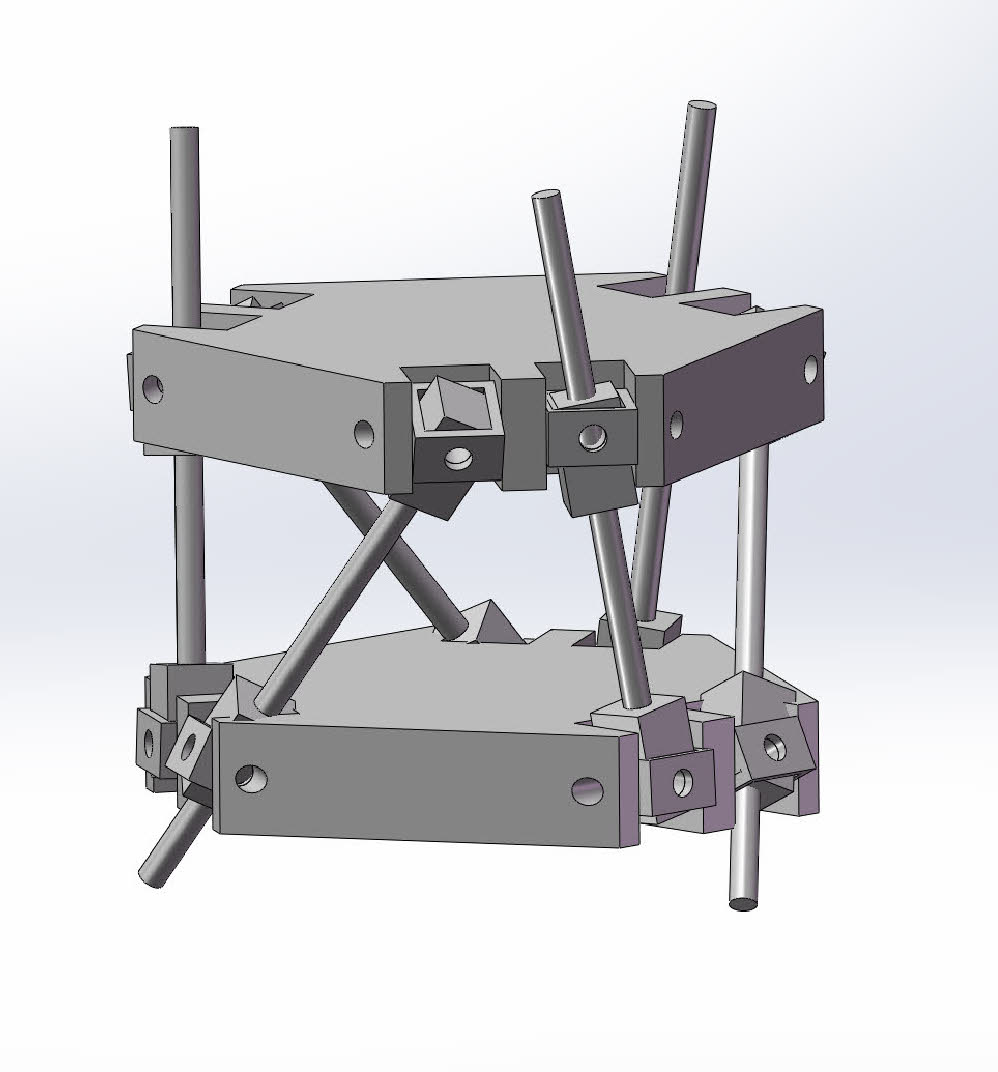 Já jsem si to představoval s těmi kardany takhle: (aktuátory nejsou zakresleny, ale představa je ta, že ty "tyčinky" by byly vlastně šrouby, ke kterým by náleželo celkem 6 pohonů (3 dole, 3 nahoře), naproti vždy matka).