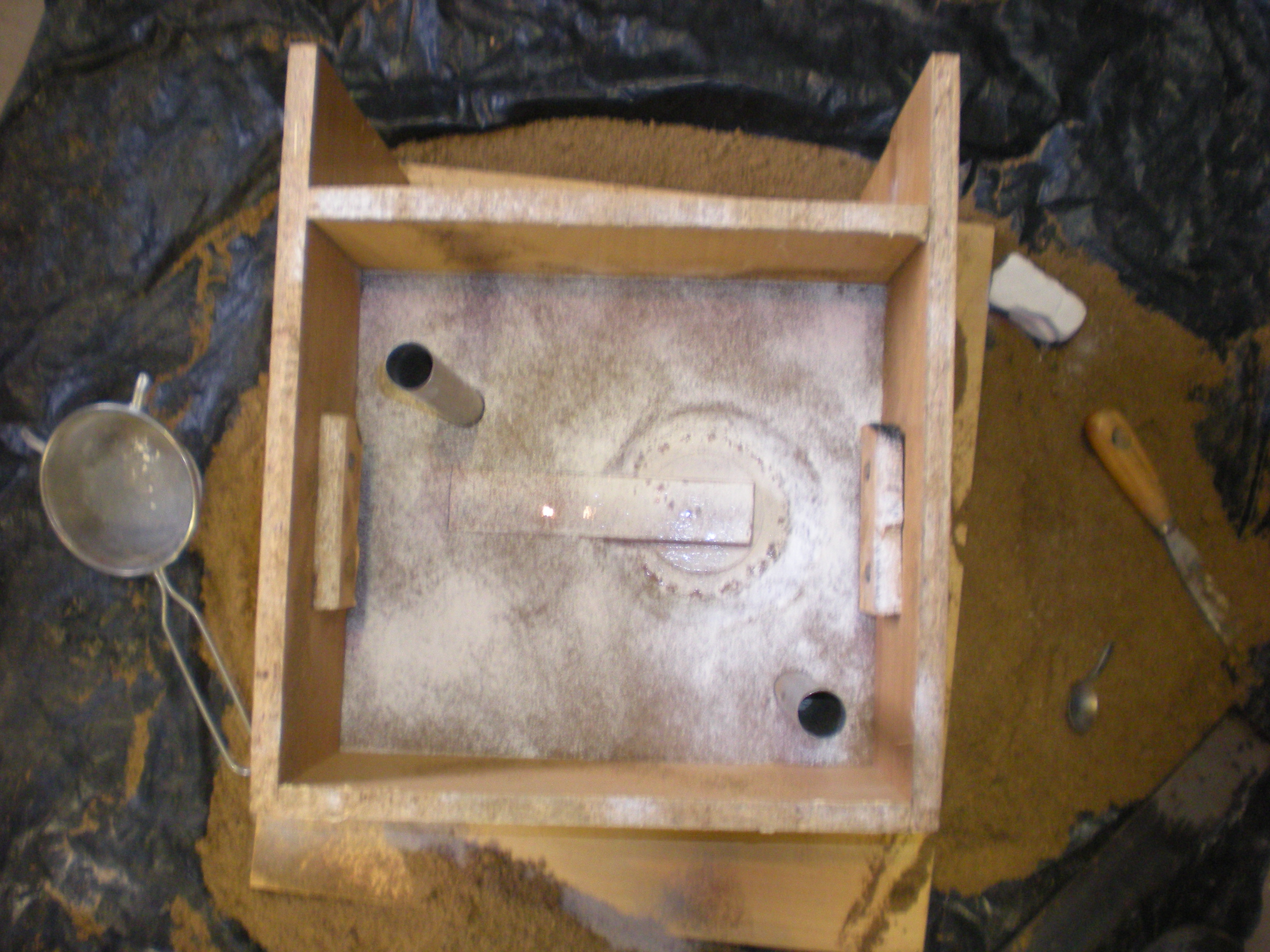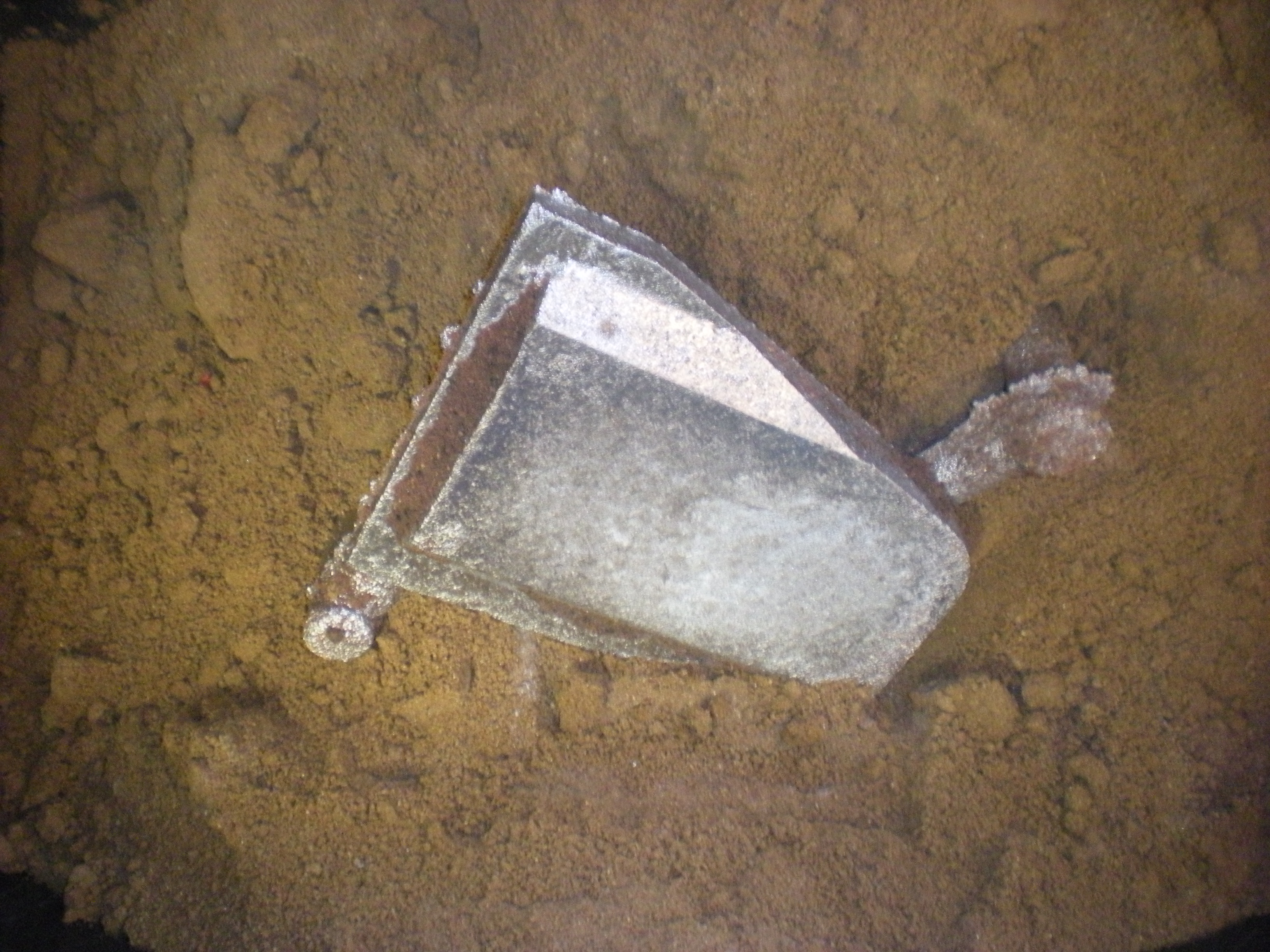 Tak jo když tu hrůzu chcete vidět tak tady ji máte. Příčina -moc suchá formovací směs.protože mám asi cirka 50kg písku tak mi vychází taktak na jedno zaformování,napřed jsem dělal ten úhlovej pojezd a po odlití a vyklepání jsem do vysušené směsi více méně jen na zkoušku zaformoval konzolu a výsledek hotová katastrofa