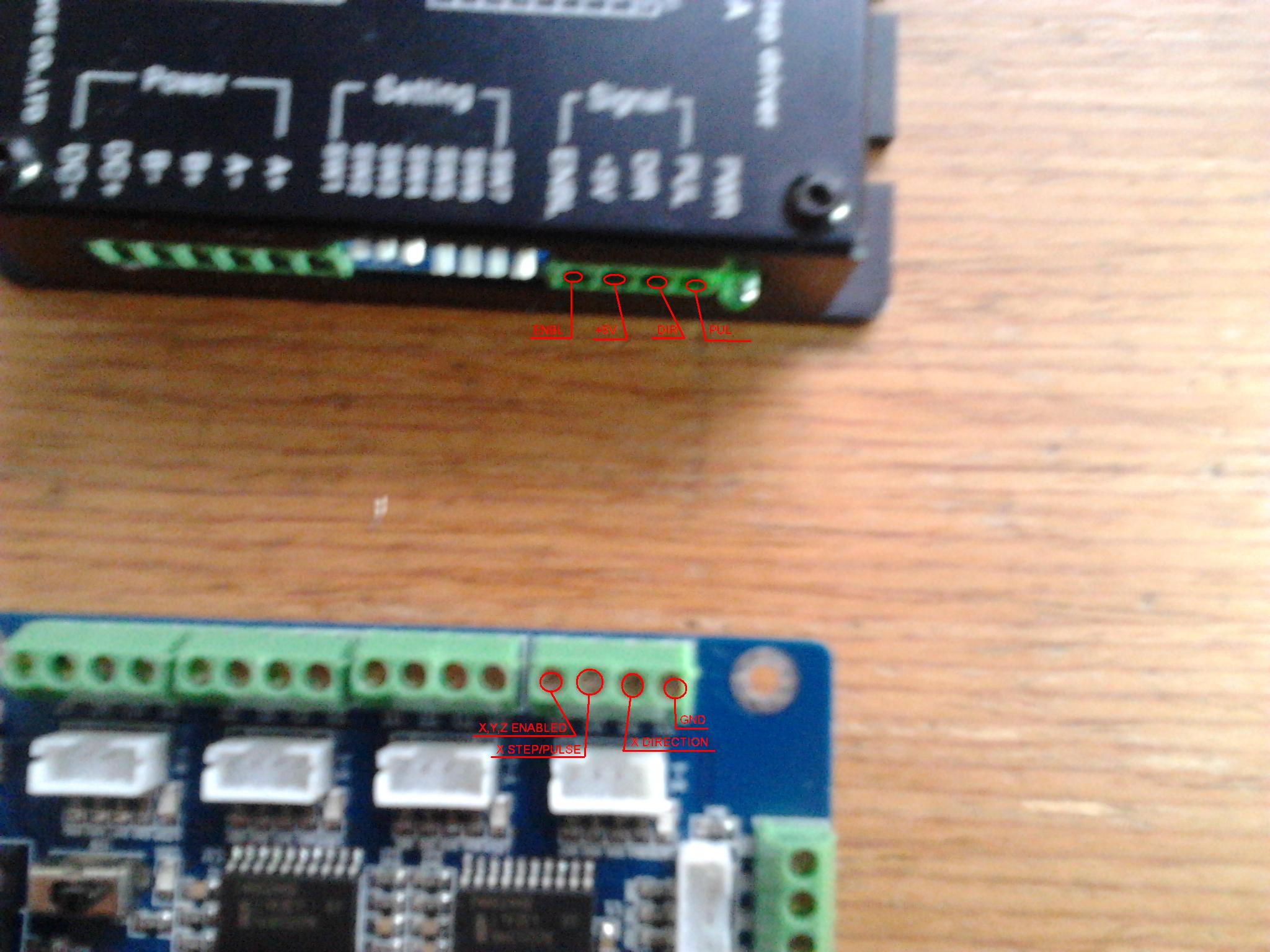Tady jsem to vyfotil....kdyby jste mi řekli co kam připojit budu vděčný...je potřeba si tan obrázek trochu zvětšit.Jde mi jen o osu X,ta deska je napájená 5V z vykuchanýho USB.Ledka napájení a když zkouším přez MACH3 jezdit v osách tak se mi u nic rozsvítí kontrolky ale motorek se ani nehne.Když připojim k driveru napětí tak motorek stvrdne a když pustím napětí do desky tak motorek povolí...
