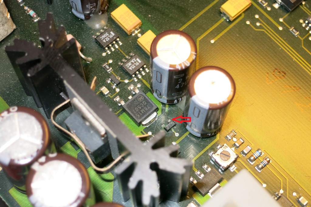 Spojil jsem nejprve opatrně odporem a když tam šlo mírumilovných 30mA, spojil jsem natvrdo drátkem. Byl to celkem tenký úsek, možná někdy došlo ke zkratu některé záporné větve nebo ho spálil postupně nápor toho jednoho filtračního elytu za ním, těžko říct, nejspíš tam byl nějakej kaz (protože ten tranzistůrek nebo co to je /AB2?/ taky na nějaký velký proudy nevypadá, regulátory jsou 100mA..)
