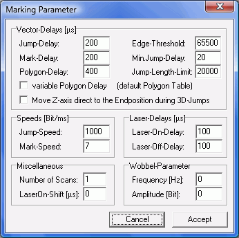 Potíž je ale v tom, že SW který jej k tomu, mi zase nějaké velké řízení nedoovoluje - tedy mohu řídit rychlost v bitech/s a další parametry, které mě moc neříkají. Je to SW HPGL od Scanlabu a popravdě mi dalo dost laborování než jsem přišel na to aby to "psalo" alespoň tak jak dnes - nikde žádné vodítko jak to nastavit (na jaké hodnoty)... viz obrázky - takhle nějak to mám nastavené pro nerez, ale jak píšu, je to do hloubky a trvá to...
