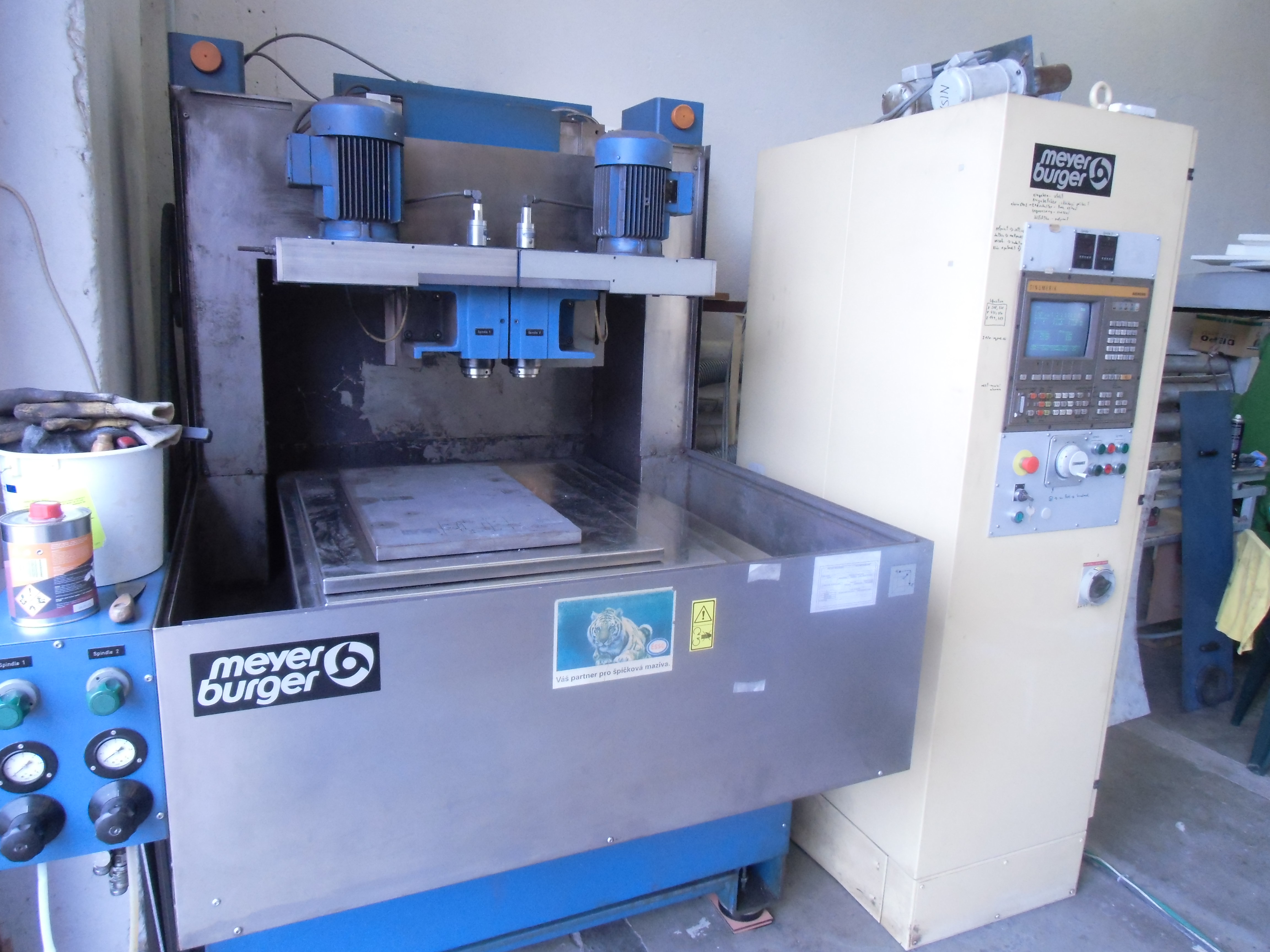 Tak ty fotky...Ono to není kaput,dá se říct že to běhá. Porucha se dělí na dvě větve.Jednak je tam asi opravdu závada protože měnič pouští při jakémkoli nastavení otáček do vřeten pouze 1 hz a taky blbne systém hlídání tlaku chladiva což je samozřejmě všechno spojeno s řídícím systémem ktrej pak hlásí chyby.Na to přijdem a měnič k tomu máme ještě jeden.Druhá větev je samotnej sinumerik.Vypadá to že někdo uzamčel systém proti změnám takže se dá spustit,najet referák,jezdit ručně posuvy atd.Nedá se přepsat referák,napsat program ( nabízí pouze podprogram )atd.Je fakt že i s manuálem to prostě nedá pro laika zvládnout.Ale už jsme našli pána co tohle spravuje.Jako systém je to fakt vychytaný,je vidět že to nedovolí udělat kokotinu na drahým obrobku jenže to právě jako začátečník nepotřebuju.Jestli jsou ve fotkách i jiný věci tak ty se řídí analogově