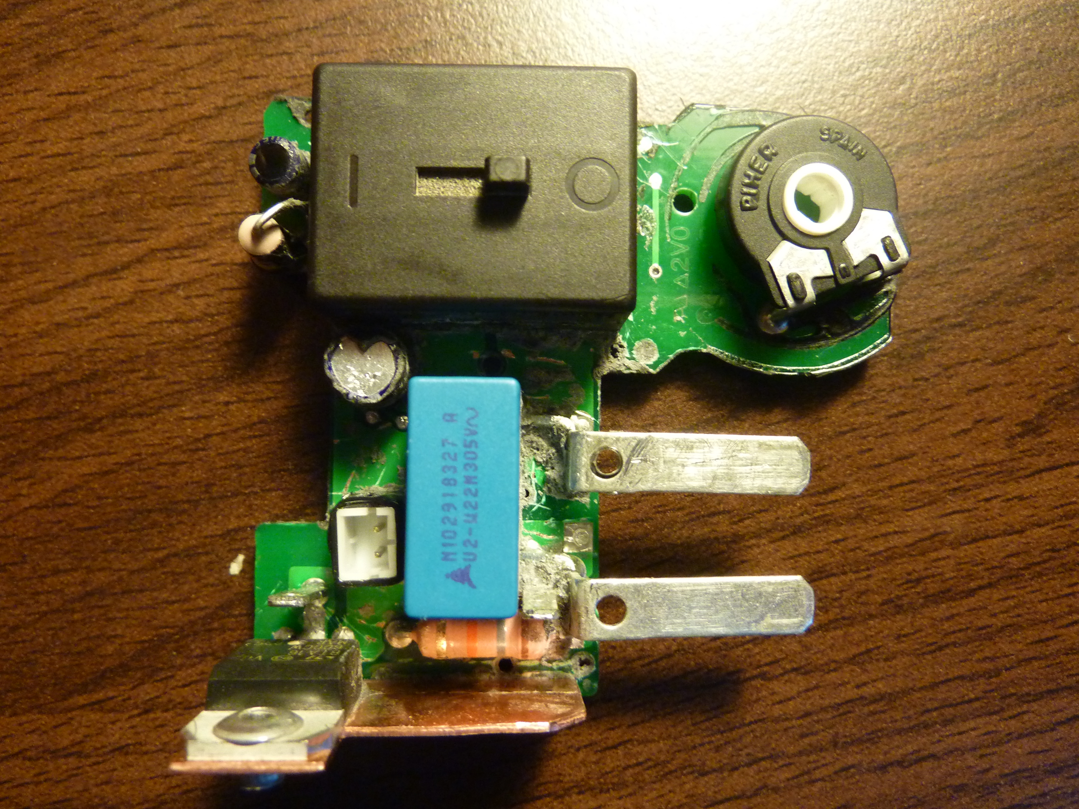 Odešel mi elektronický regulátor frézky Kress 1050 FME. Ze zvědavosti jsem odstranil vaničku z umělé hmoty, ve které byl uložen, rovněž i pryskyřici, ve které byl zalit. Třeba to někoho zaujme...