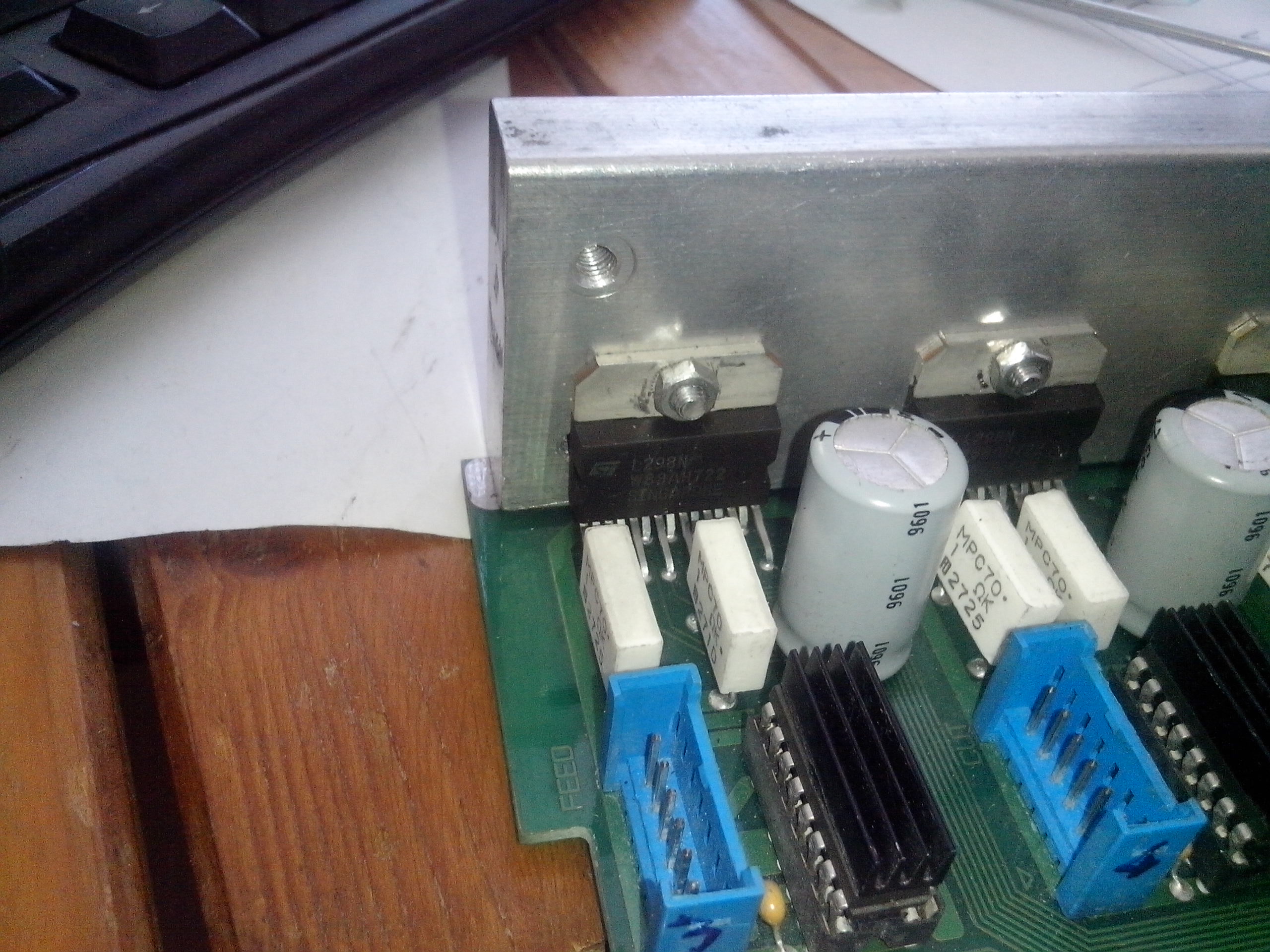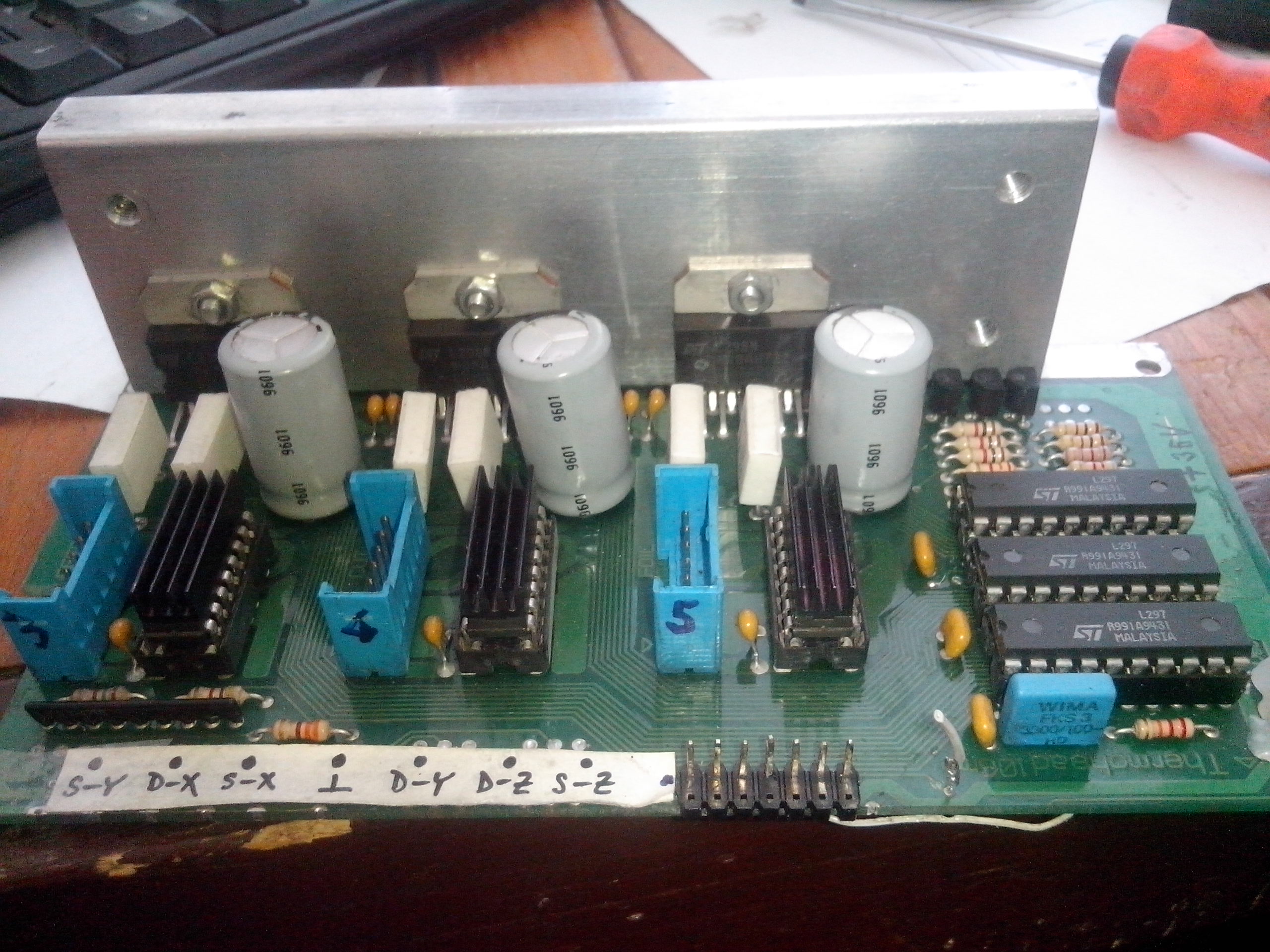 Zdravím včera jsem byl ve Strakonicích se známym pro stojanovou vrtačku a prodejce je trošek zapálen do cnc, tak sem dali řeč a vyhrabal tam bedynku a ejhle byl to ovladač pro 5ti osou mašinku s l297/8 . Drivery by měli bejt plně funkční. Tak sem neváhal . Doma mi to nedalo a hned sem krabičku rozhodil a byl sem mile překvapen( možná trošek zklamán ale výsledek je kladnej). V krabičce byl toroid 2x36voltu usměrněn ve zdroji sraženo napětí na 35voltů stejnosměrnejch. To hodnotim jako velice kladné. Bohužel chybí jakékoliv galvanické oddělení a spínací obvody(vřeteno......) to vyřeší oddělovací deska.Samotné drivery jsou tovární výroby . Bohužel nejsou kompletní vstupy z nich někdo uříznul a nechal jen spínací část takže vstupy jsou privedeny docela na hulváta ale funkční to bude. Drivery jsou celkem na 2 deskách jedna desky je pro 3 osy . Na druhé desce jsou osazené jen 2 osy (proto 5ti osa) tento driver udajně sloužil pro motory NEMO 23. A tedka se dostáváme ke kámenu urazu.... zajímá mě nastavení proudu na těchto driverech:-D Prosim o radu jak nejlépe nastavit. Protože jsem se koukal na datasheet na zapojení l298 na výstupu 1 a 15 mají odpory 0,5ohmu a já tam mám 1ohm tak nevim co to bude dělat navíc plánuji dávat jiné motory tak bych nerad něco ...... Předem děkuji za rady a zkušenosti s těmito obvody