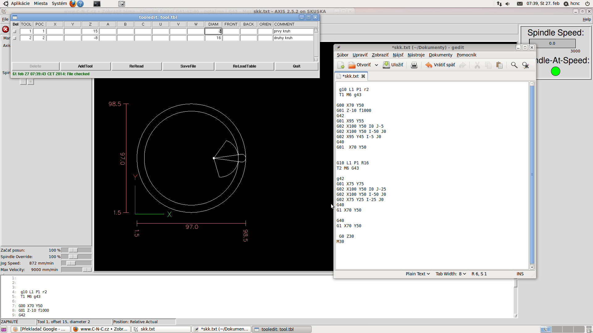 najlepsie bude ak budem robiť takmer stvrtkruh naprazdno a hotovo. Totiž to , chcem, aby som vedel pisať tento jednoduchy kod z hlavy a aby som postupným pridávaním priemeru nastroja dopasovaval otvor na stotiny. Softverovo sa da všeličo spravit.