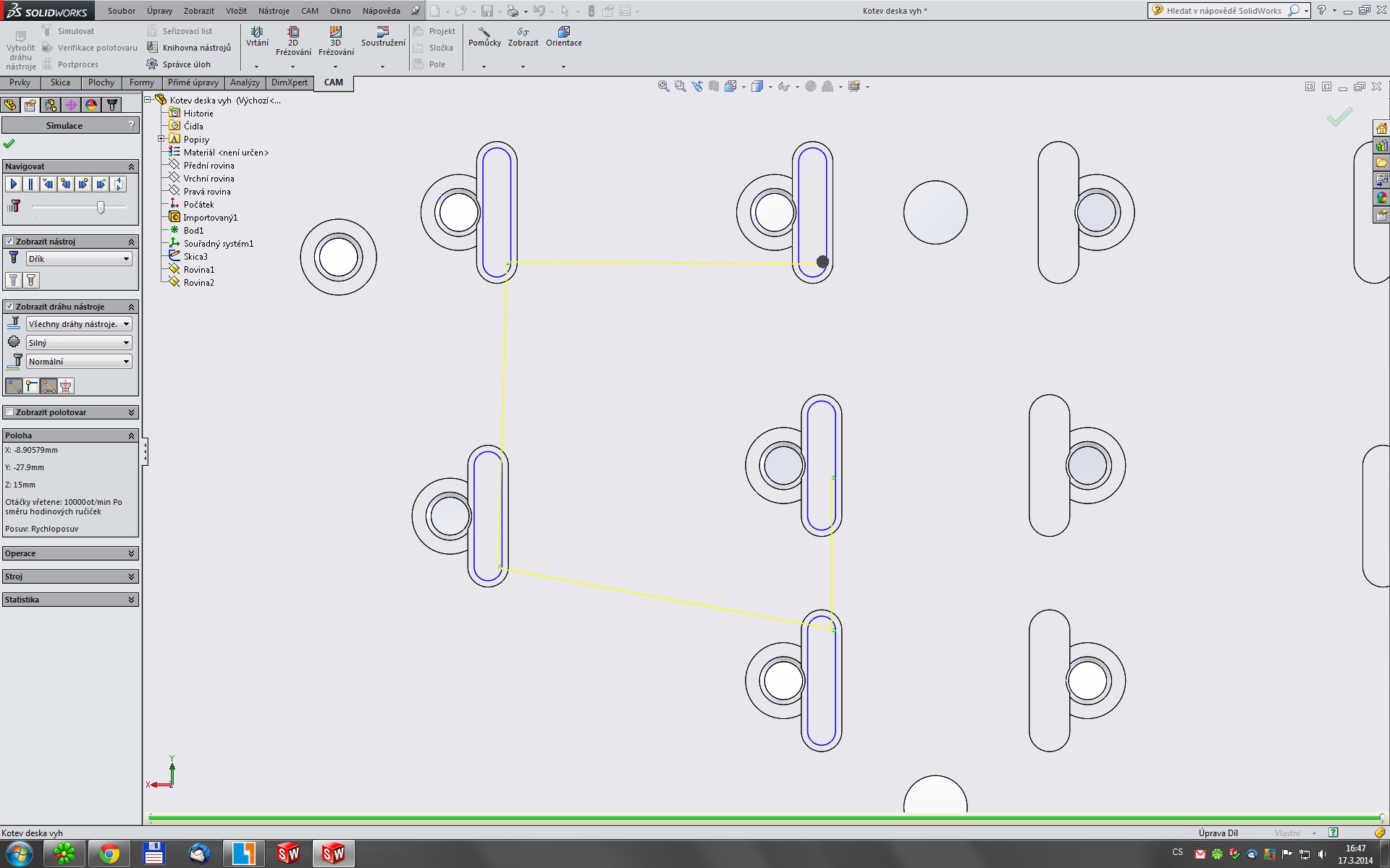 zkoušel jsem všechno možné a vypadá to, že s již vytvořeným polem, neumí dále HSMW pracovat(ozrcadlit, otočit, posunout...) v lepším případě to neumíme my dva :D ...v případě takové desky a obrábění drážek je samozřejmě velmi jednoduché to obejít tím, že se ozrcadlí přímo ta skica které je vybírána následně jako geometrie k obrábění. A navíc je to vhodnější kvůli dodržení směru obrábění. Ale to je jasné asi každému. Ovšem mám tady spoustu modelů kdy to takto obejít nelze.