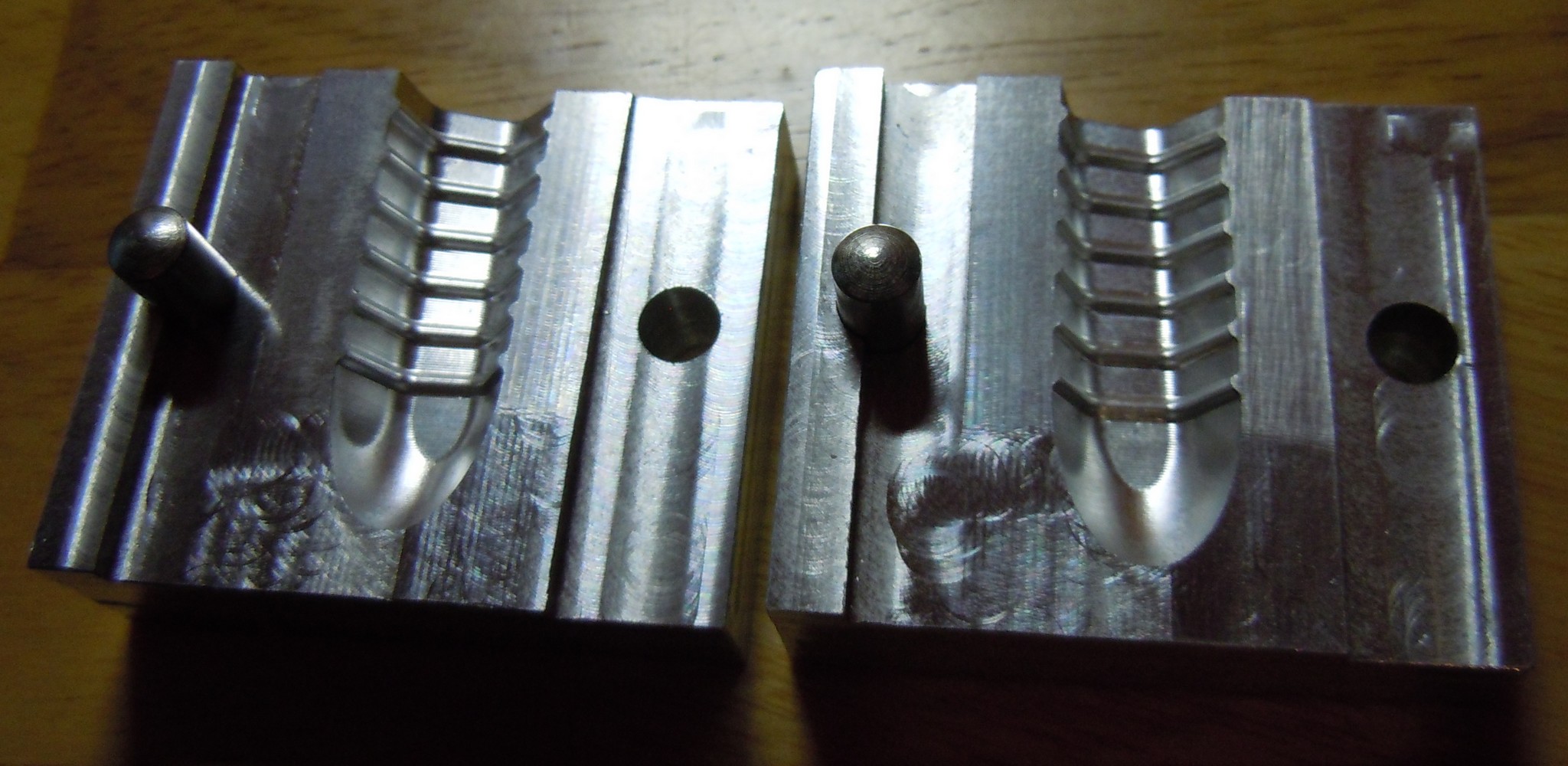 Tak jsem to vyfrézoval z duralu. Obě poloviny jsou úplně stejné. Na fotce není úplně patrné, že dělící plocha není rovina. Bohužel zatím nevím, zda to k něčemu je.