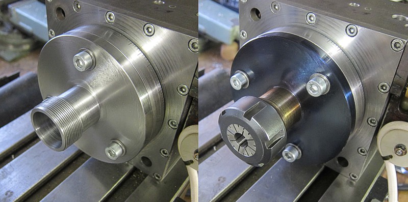 Tak držák sklíčidla už je hotový. Teď už není problém, po povolení šneku, díky němu a 100kovým hodinkám, doklepnutí středu osy hřídele na setinu milimetru. Další výhodou je průchozí díra skrz kleštiny a rotační osu. Už tak nejsem omezený délkou upnutého výrobku. Dost limitující to bylo například při výrobě pastorků. Nyní si v soustruhu stočím pouze konec kulatiny na správný průměr, současně odvrtám středový otvor a pak po srovnání v držáku pomocí hodinek, můžu vytvořit na konci přesné ozubení. Hotový pastorek stačí jen upíchnout na soustruhu.