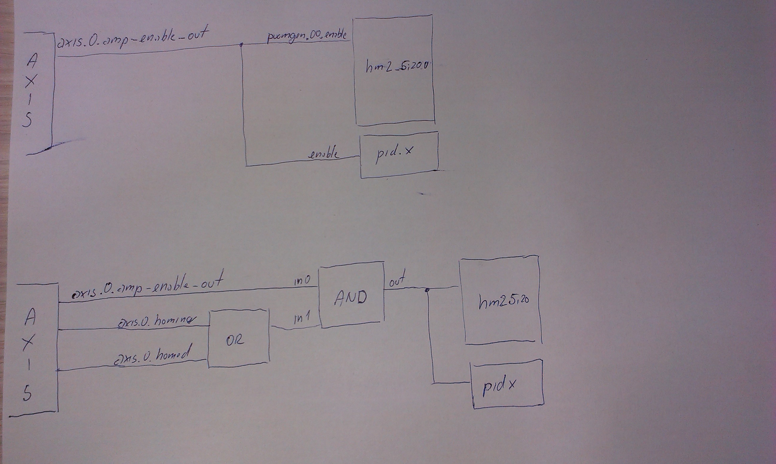 z AXIS leze axis.0.signal amp-enable-out, kterej je aktivni pri zapnuti stroje a je napojenej na stepgen-enable pro KM (stepconf), nebo na PIDx-enable a soucasne na pwmgen pri pouziti MESY (pncconf).
