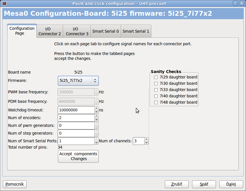 Zakúpil som si karty Mesa 5i25 a 7i76. Teším sa z toho, nedari sa mi však zostavu rozbehnúť. Nainštalované to mám azda správne, firmware 5i25_7i76x2. V Pncconfig konfiguráciu, avšak LinuxCNC nerozbehnem. Skúsil som i iný firmware (7i77_7i76), výsledok podobný. Linux poznám iba okrajovo, nedokážem si sám poradiť a rád sa priučím.
