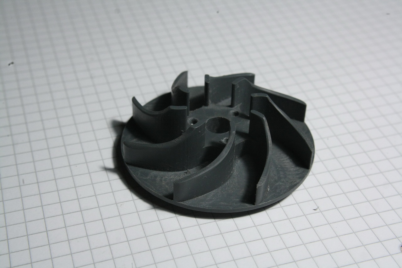 Tak teď už kolo pro čerpadlo, předtím to byl jenom test. pr 60 mm, Tloušťka stěn lopatek 1,5 mm šroubky jsou jako protipol magnetů (tak aby to fungovalo jako bezucpávkové uložení s magnetickou spojkou) v případě že to bude nedostatečné tak zalepím magnetky i do kola. Ten plast který používám je snad neměkčené PVC, docela pěkně se to obrábí jenje potřeba ostrý nástroj kterým se nehráblo do kovu, ani do hliníku. A je tak tvrdší než polyetylen nebo polyamid.
