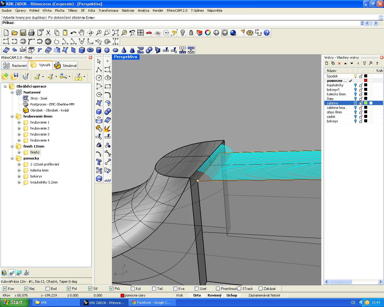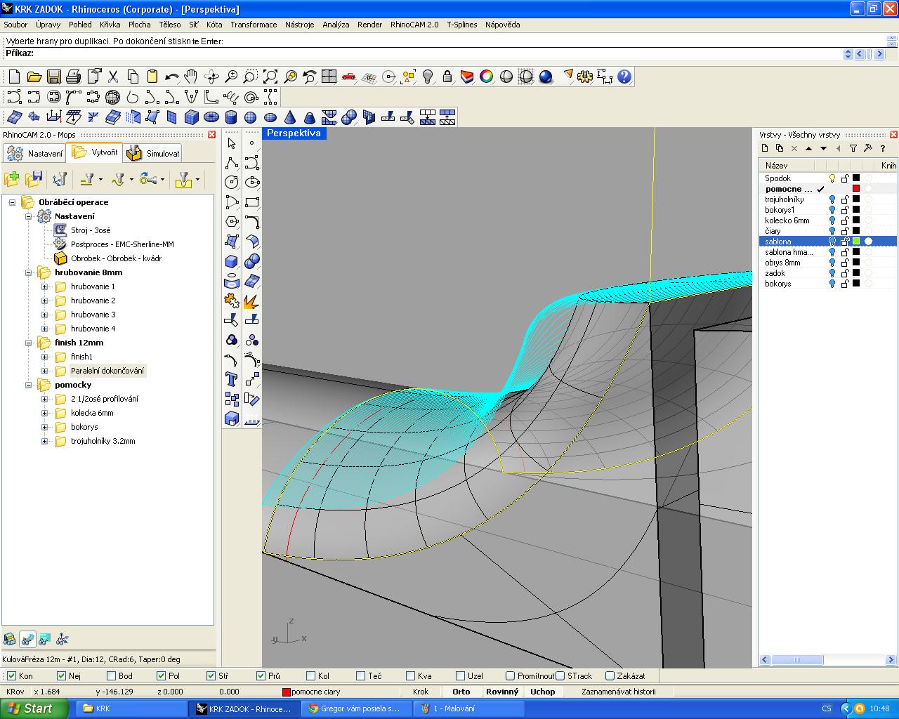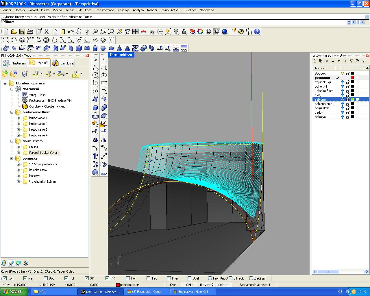 Nazdar chalani ... chcem sa spytat taku vec kresli a programuje niekto v zostave RHINOCEROS A RHINOCAM? Nastal u mna taky problem programujem jeden vyšší krk a finish mi nejako zle počíta dráhy. Zadal som Paralélne dokončovanie, nástroj 12mm gulička, obrábanie podla regionu - označený na obrázku, bočny krok 6% nástroja a tie drahy su nejake divné vobec nie podla obrobku a neviem čo s tým