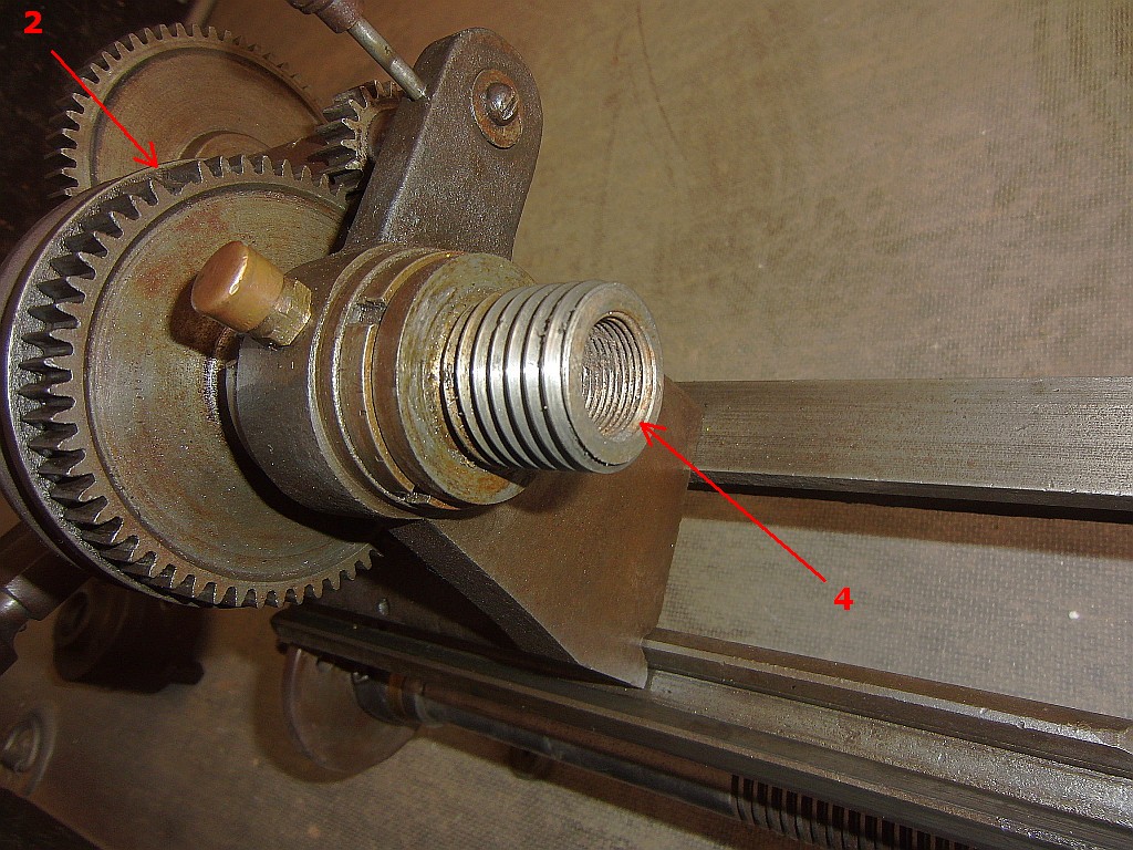 Bingo! Teď je mne fungování předlohy už jasné. Přes řemenici je poháněno malé ozubené kolo, které se společně protáčí na hřídeli vřetena, pohání pak převodem do pomala přes kola připojené předlohy velké kolo bez zubu, které je pevně spojené klínkem s hřídeli vřetena. Vřelé díky.