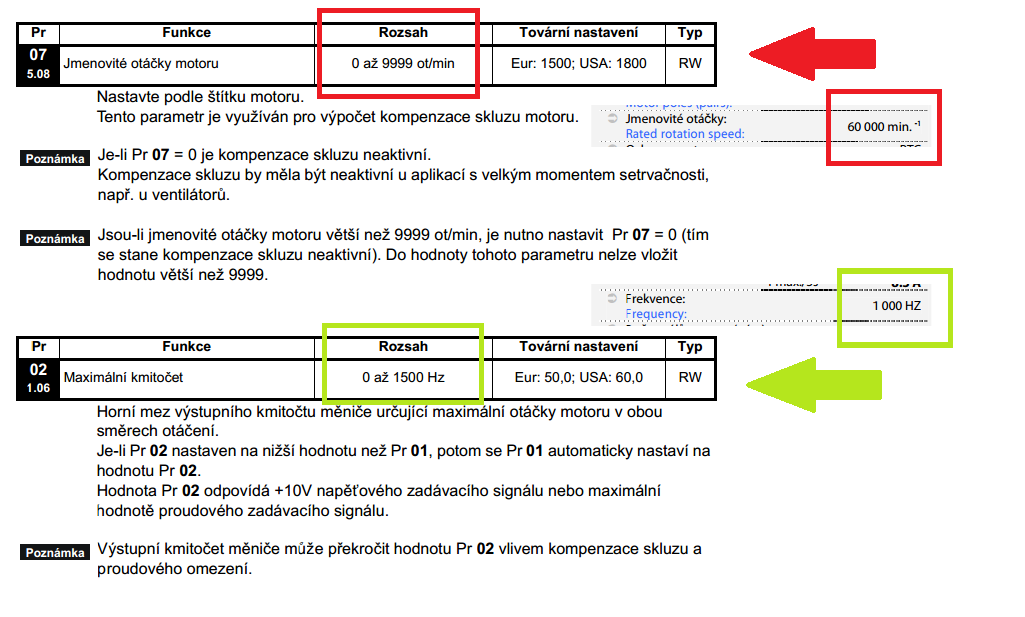 Dále však vzhledem k Vámi uvedeným otáčkám doporučuji ověřit max. výstupní kmitočet měniče. Původně je měnič určen pro max. kmitočet 1500Hz, ovšem již nějakou dobu se vyrábí na základě nové evropské směrnice většinově s max. výstupním kmitočtem 600Hz. Vyšší kmitočet by měl být stále dostupný na zvláštní vyžádání.