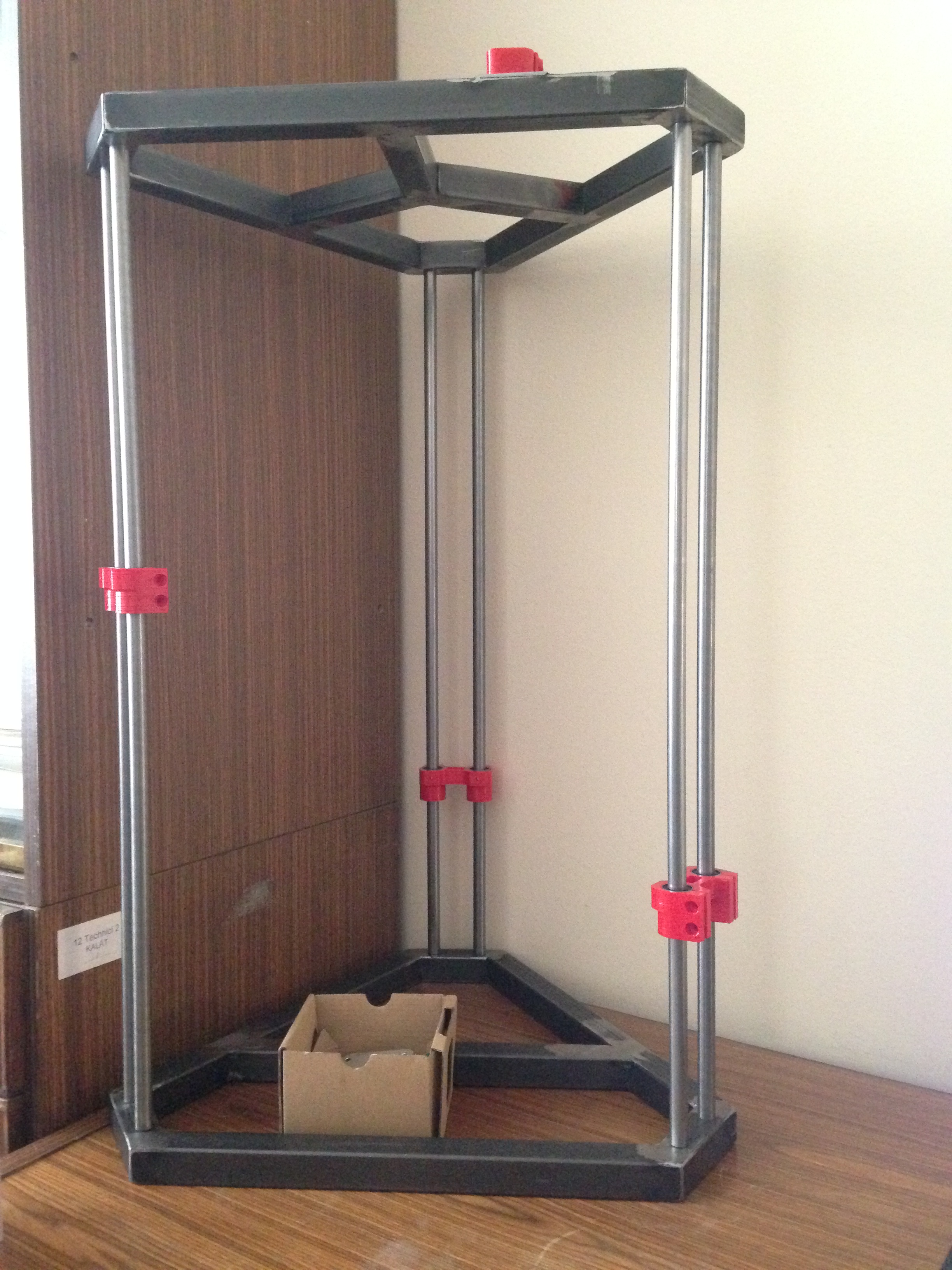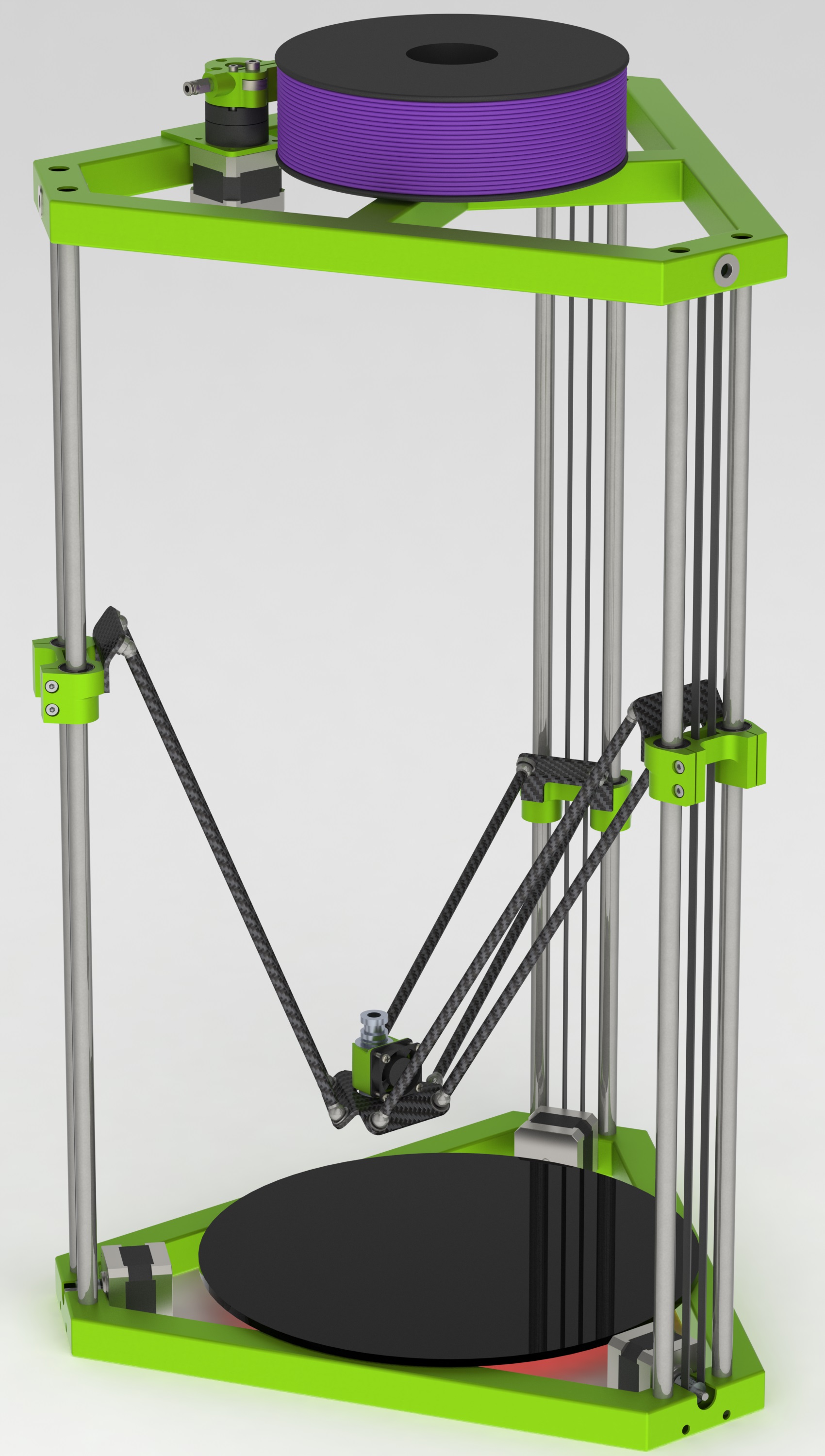 chtěl bych se Vás zeptat na radu popř. zkušenosti. Zatím jsem nestavěl ani CNCčko, ani 3D tiskárnu, jen jsem o tom hodně četl. Chtěl bych si ale postavit 3D tiskárnu po vzoru Rostocku, pracuji v SolidWorksu denně, takže si ho chci i sám navrhnout. Moje představa je aby tisková plocha měla průměr cca 250mm a celková výška tiskárny byla kolem 650mm. Chtěl bych použít broušené tyče H8 ( dočetl jsem se, že by mělo jít použít i H9) a vozíky LM12UU. Líbilo se mi řešení s použitím magnetů, tak bych ho chtěl zkusit. Táhla bych chtěl mít dlouhé asi 200-250mm z carbonové trubičky 7mm. Konstruki bych chtěl mít spodní a horní část asi umělé dřevo (sicablock) a menší části hliník. Motory asi Nema 17. Zatím mám hrubou konstrukci (viz. obrázek), ale postupně budu dodělávat zbytek. Myslíte, že to bude takto stabilní? Díky moc za všechny připomínky.