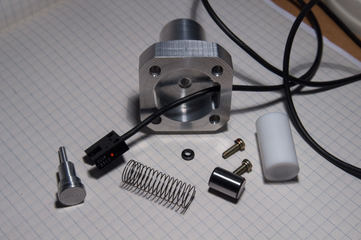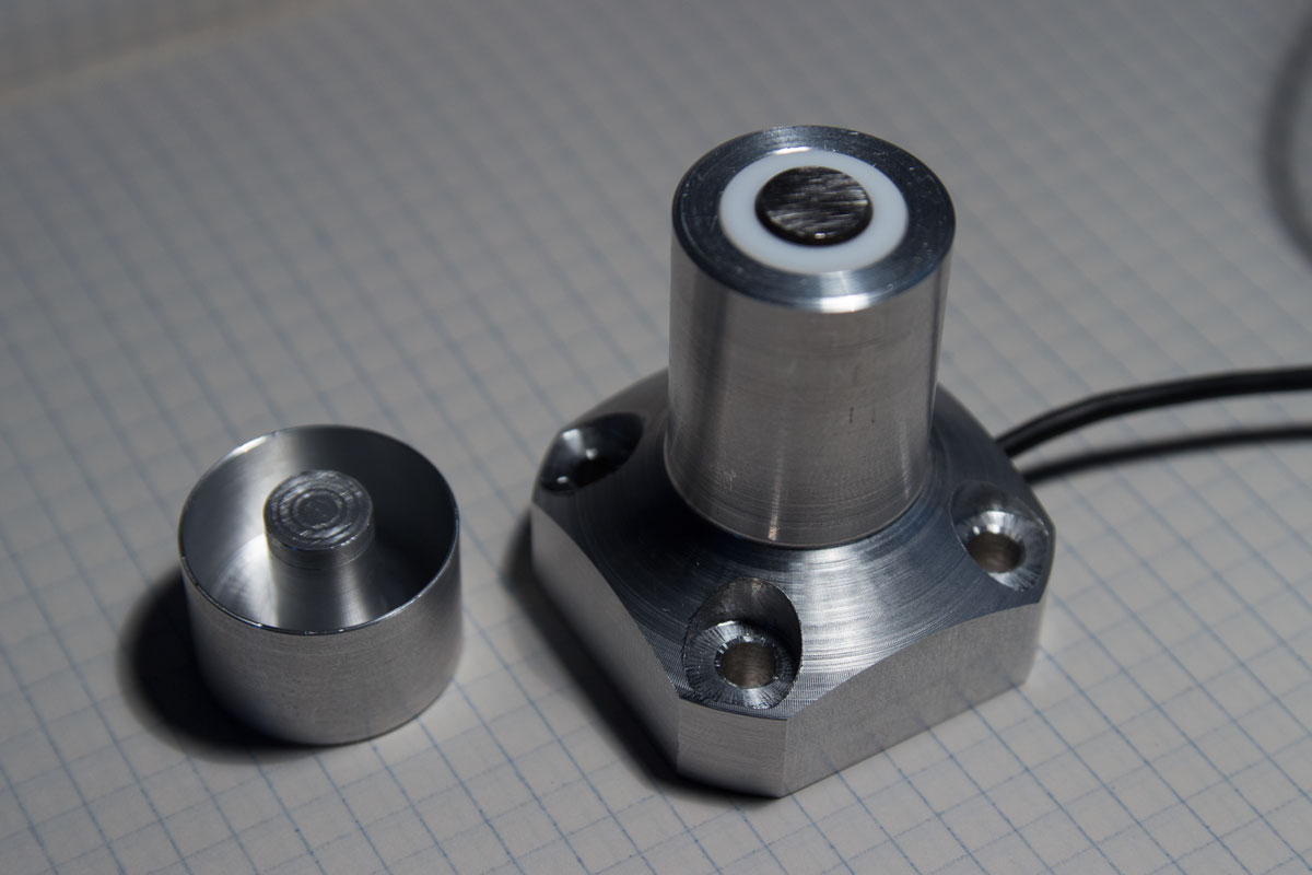 Pokus o krytku místo ložiskového válečku. Funguje, ale přesnost bude horší a výroba nic moc když je to z jednoho kusu. V místě senzoru uděláno "futro" pro lehčí a přesnější vedení osy, zmenšena osa na 3mm aby se méně projevila chyba náklonu (Inspirace RaS) V rozsypu pro představu (ten ocelový váleček se na Al trn nakonec možná nalepí aby střed určoval ložiskový váleček a Al trn se nešudlal po teflonu.)