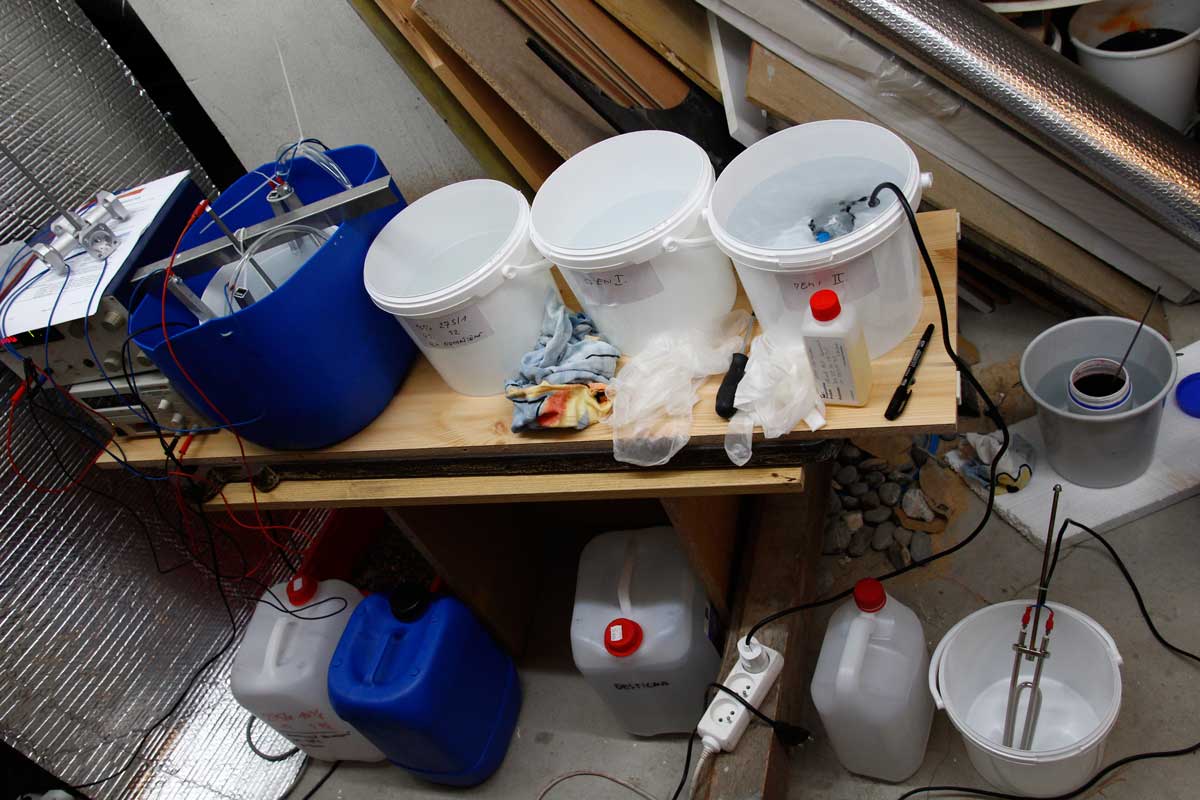 4. eloxování - kyselina sírová 17% (3l kyseliny do baterky + 5l DEMI), proud 2-3A/dm2 (napětí se pohybuje kolem 15V), protielektrody 3x plocha výrobku, teplota do 25°C, čas 30-60min