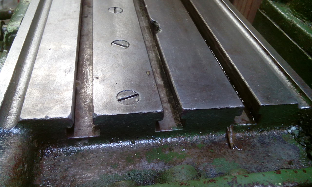 té drášky je poctivá litina...poškození jen jedno menší ale stálefunkční kousnutí...zespoda jsou jen lehce vytlač-šoupané od upínek ...a ty šrouby držej totiž hřeben (zespoda stolu hned vedle trapézu) ke klikovému "rychlo-ručno-posuvu ....dvě a půl otáčky na celou délku (230mm)