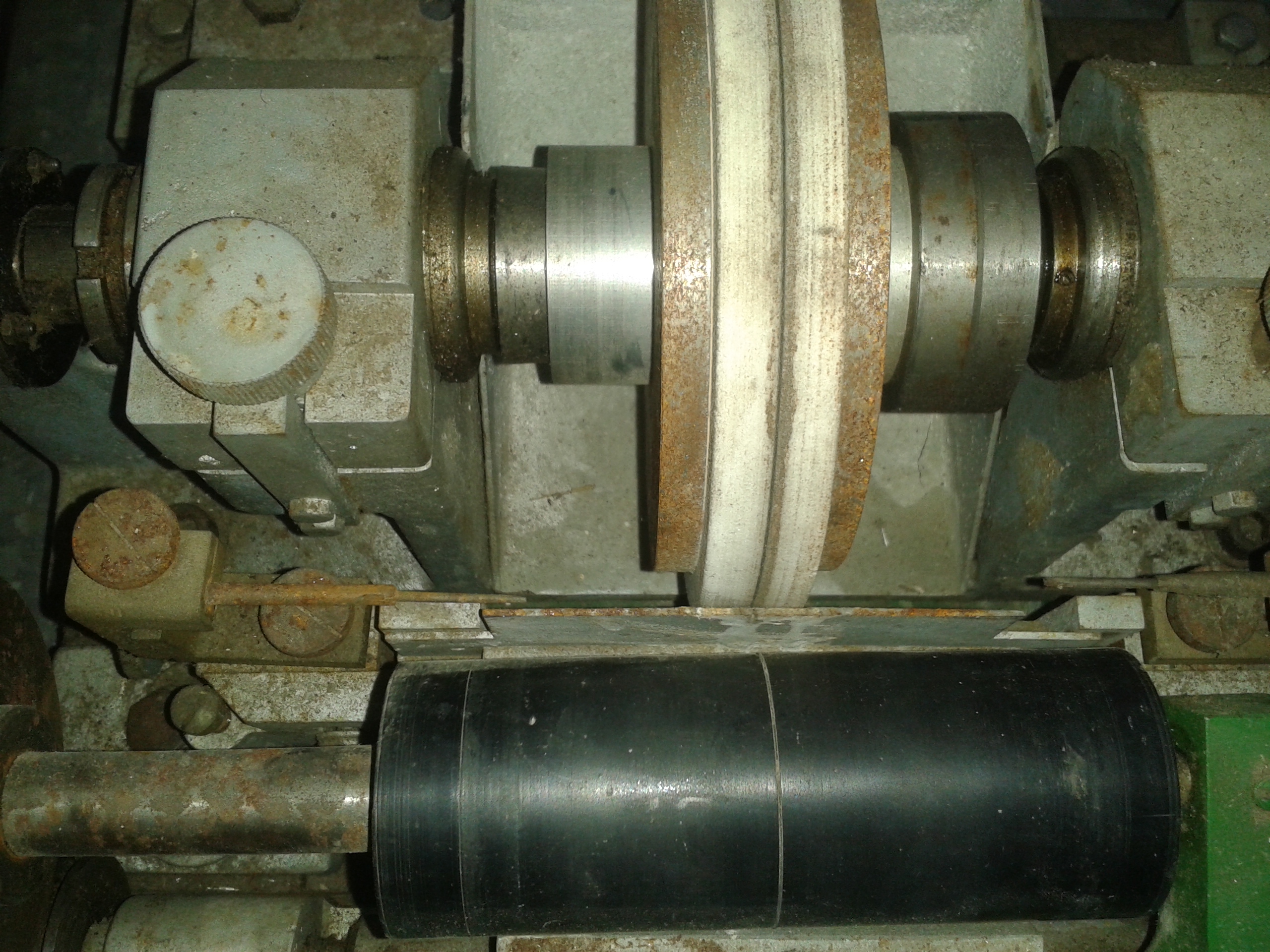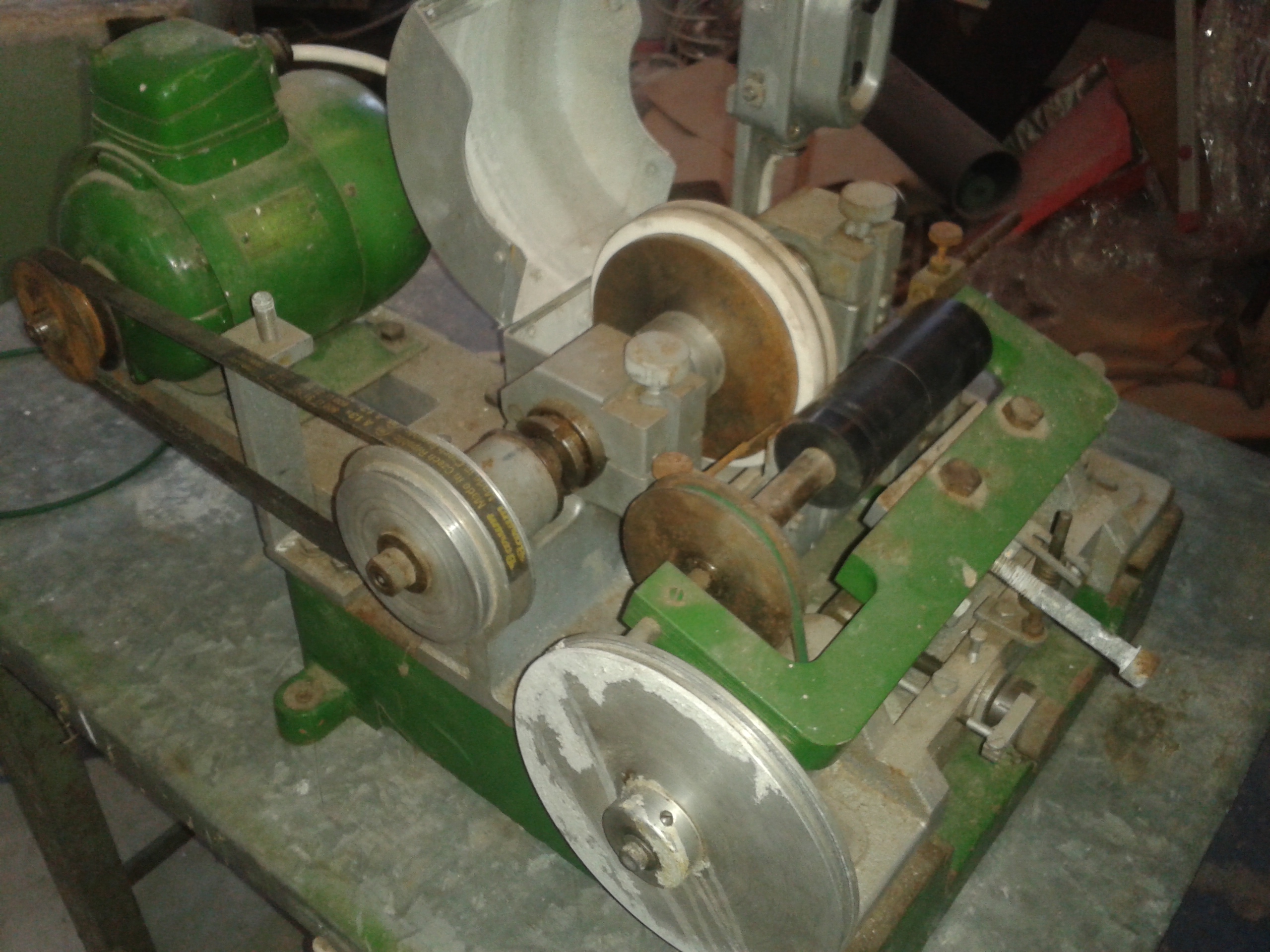 na prvním snímku je vidět i to "opěrné" pravítko (ten orezlý plech mezi válci). Určena k broušení hřídeloviny, čepů kolíků. Jinak má na sobě i dorazy ( pravý a levý) a pravděpodobně i nastavení úhlu nastavení opěrného válce, který podle vzdálenosti od brusného kotouče a vysunutí pravítka definuje průměr obrobku a rychlost úběru (posuv do záběru). Jednoduchý popis pro orientaci.