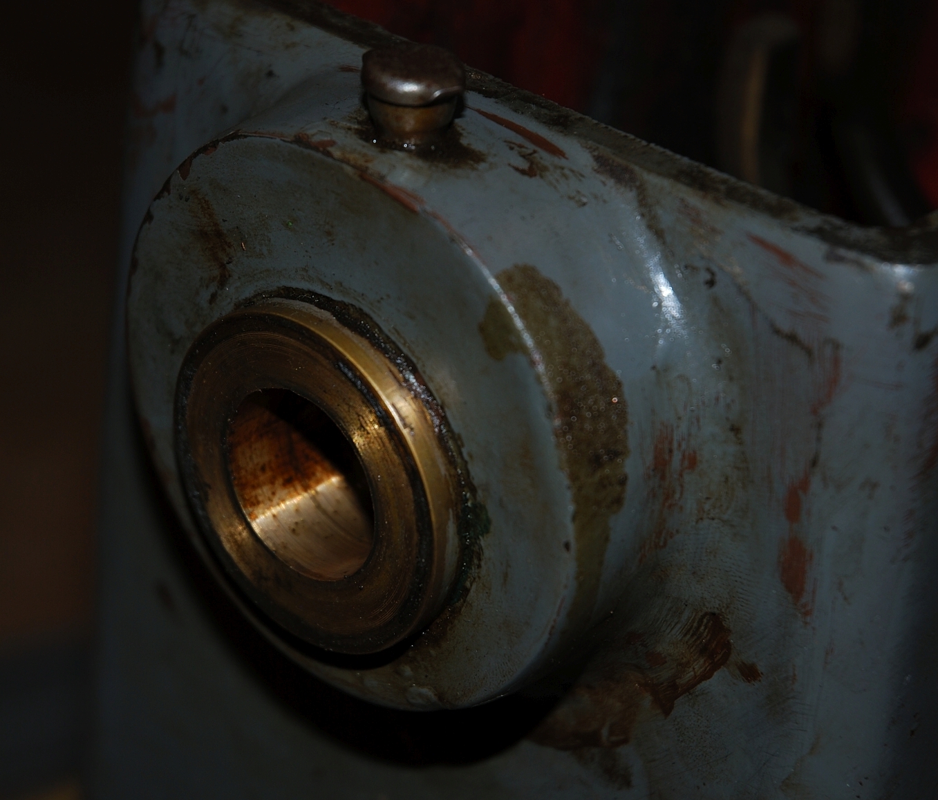 A podle mě tam chybí nějaká ucpávka (filcový kroužek nebo něco takového) v tom "duralovém" kroužku, aby do toho ložiska nepadal bordel. Vzadu klasika, bronzové pouzdro + axiální ložisko. Dvourychlostní řemenová převodovka má dvě třecí spojky. Na té pravé chybí obložení viz foto.