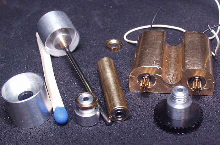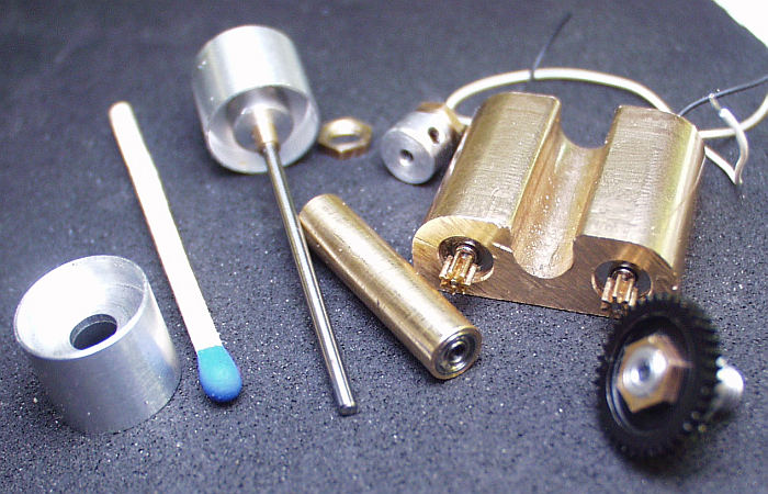 Je to pohonná dvoumotorová jednotka pro autodráhový model měřítka 1/43 ... zatím ve vývojovém stádiu. Převod je modul 0,3 pastorky 7 zubů, kolo 38 zubů, náboje mají průměr 6mm, osička 1,5mm, kuličkový ložiska 1,5x4x2mm, červíky M2x2, matky M4x0,5 :) Motory jsou z mikrovrtulníků, mají 7x16mm. Hmotnost sestavy rotačních částí, tedy disky, náboje s maticema, hřídel, ložiska a disky činí 2,9gramu.