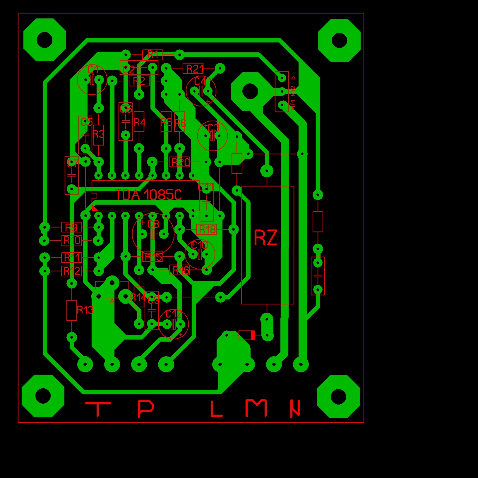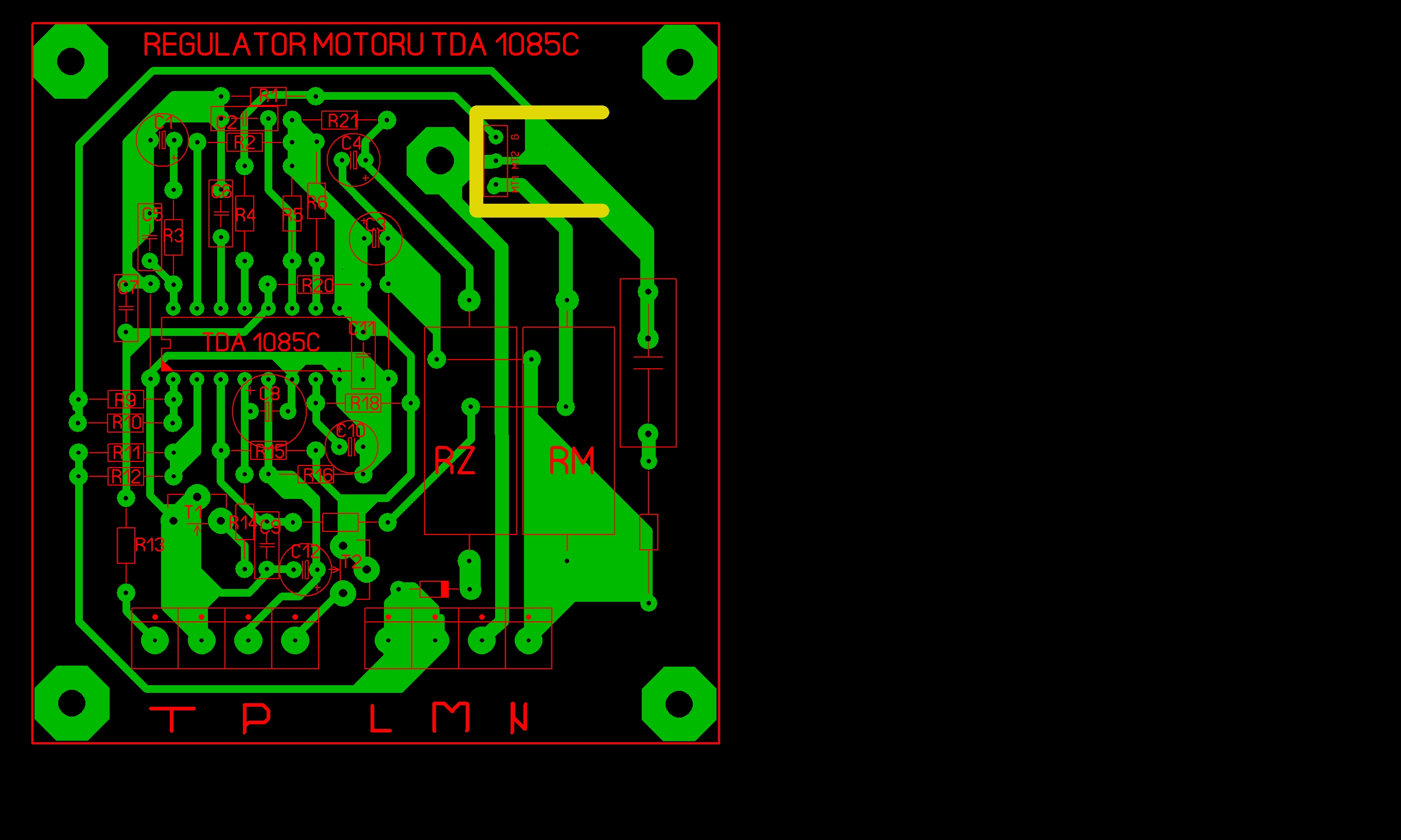 Ještě mě napadlo udělat verzi s výkonákama na motor a bez nich. Bohužel Ve verzi s výkonákama na motor by museli bejt daný na stojato. Což by asi nebyl problém ale spíše propoj pod nima. Ale toby taky zas tak nevadilo výkonáky bych dal určitě kousek nad plošnák at můžou dejchat. Jinak velikost plošnáku je 65x77 Takže regulátor by se mohl vejít do elektroinstalační krabičky co je na omítku.