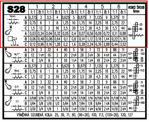 Ale ony ty tabulky v manuálu vlastně jsou, jen si to dát trochu do souvislostí a přemýšlet o tom co čtu. Ty štítky co jsem zde uvedl minule byly podklady pro výrobu laserem gravírovaných štítků, které jsem na svou S28 dával já. Jen pro upřesnění, ten štítek s nastavením pák a výměnných kol platí pro stroj s vodícím šroubem se stoupáním 6mm. Pokud by jsi měl stroj se šroubem 1/4" tak pak neplatí sestavení výměnných ozubených kol na závity! Z tabulky č.25 v manuálu stroje je to zřejmé.