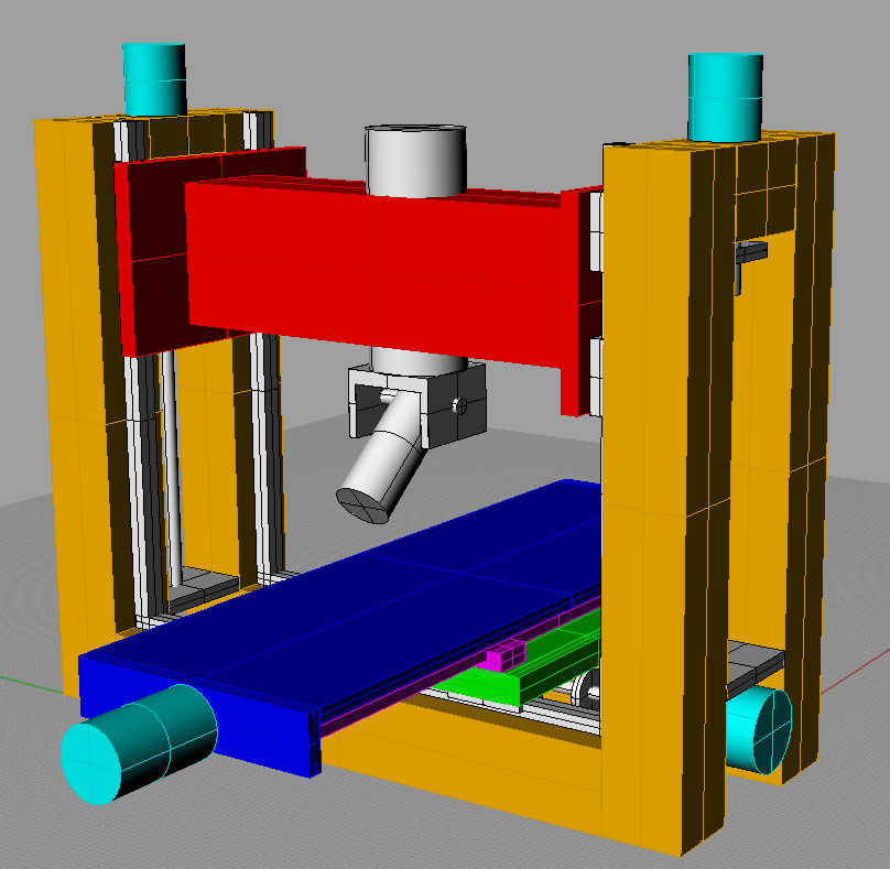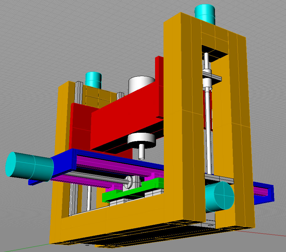 Uvazuju nad koncepci portalove frezky pracovnich rozmeru zhruba tak 400x250x250mm. Zakladni pozadavek je vyrobitelnost v domacich podminkach a hlavne vysoka tuhost.Na obrazkach je jedno reseni,ktere mi pripada docela pouzitelne.Osy X a Y tvori klasicky kriz na lin vedenich,ktery je snadno vyrobitelny a presny.Osa Z na portalu,ktery se zdviha cely vcetne ramene,coz zajisti max. tuhost,resp. min rameno pro vzik vibraci od nastroje.Nevyhodou jsou 4 vedeni,2 srouby a 2 motory.Nicmene se mi tohle reseni jevi z hlediska tuhosti jako nejlepsi.