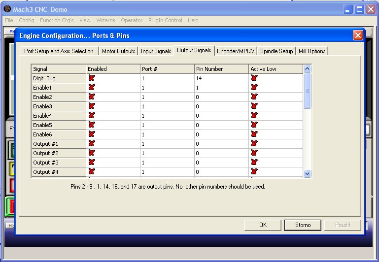 zdravím mám takovou potíž, koupil jsem jeden CNC a nějak to nemůžu spustit. Předtím kyž jsem to kupoval tak jsem to viděl funkční. Na svojí desce nemám vyvedený LPT, tak jsem použil na kšandě. V PC se hlásil jako v pohodě, ale když jsem to zapojil do stroje, tak ten pořád hlásil chybu a nešel restartovat. Tak jsem použil PCI desku Moschip a ten nainstaloval lpt a 2 com. Bylo to označený jako LPT3, našel jsem adresu cd00 viz obr tak to taky hlásilo chybu, když jsem tam dal až tu druhou cc00 tak to teprv přestalo hlásit chybu. Zapojil jsem to podle webu na caucau viz obr, sice to virtuálně funguje, ale motory se nepohnou. vřeteno se zapíná zvlášť. Koncové spínače zatím nemám zapnuty, tak jsem ty x++ a y++ zatím nezapojoval. Akorát ten estop jsem zapojil podle webu na pin17. Když jsem to podle webu zapojil ten digittrig tak to nedělalo nic a když jsem zapojil enable1 tak mi to na stránce diagnostic hlásilo červeně, ale každopádně to ani v jednom případě taky nedělalo nic.