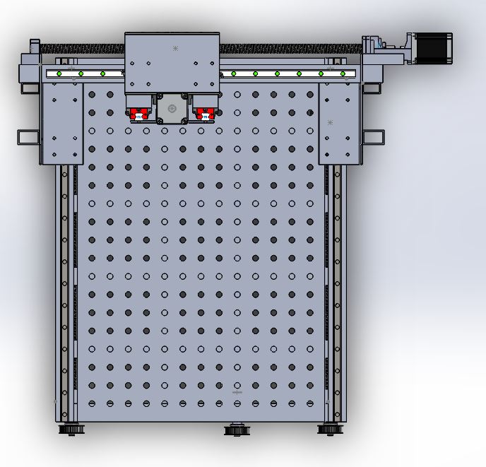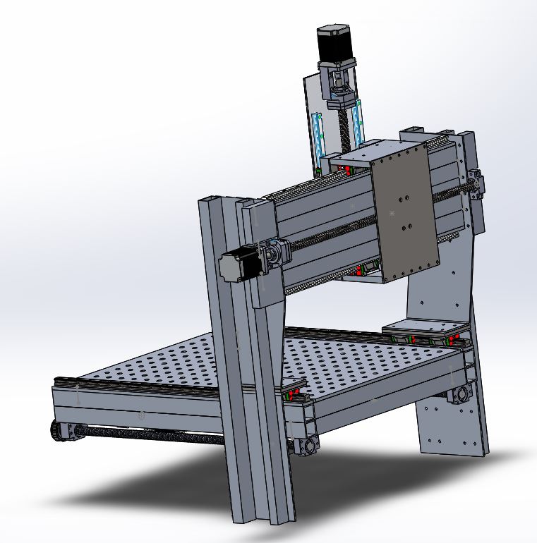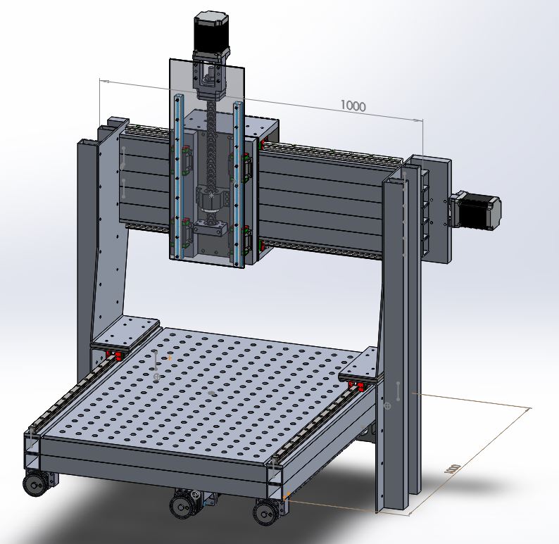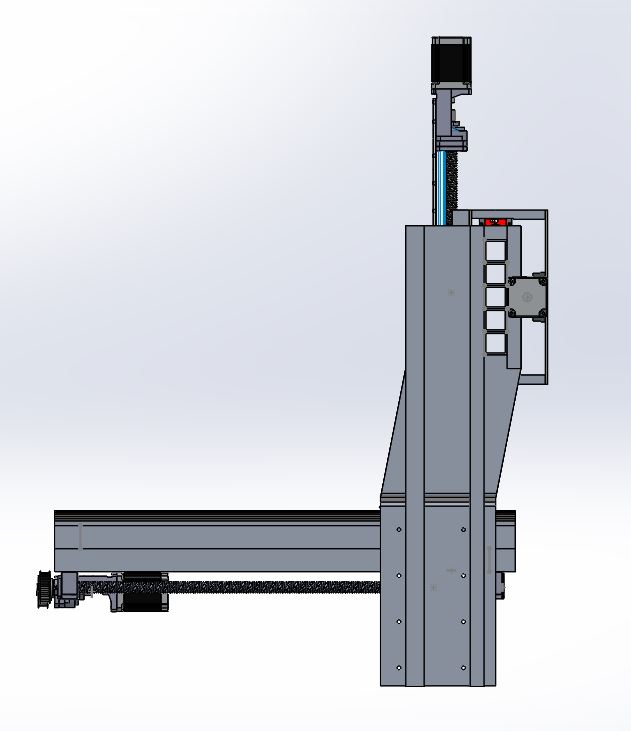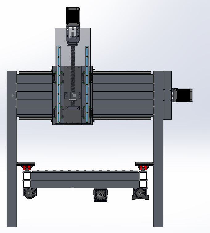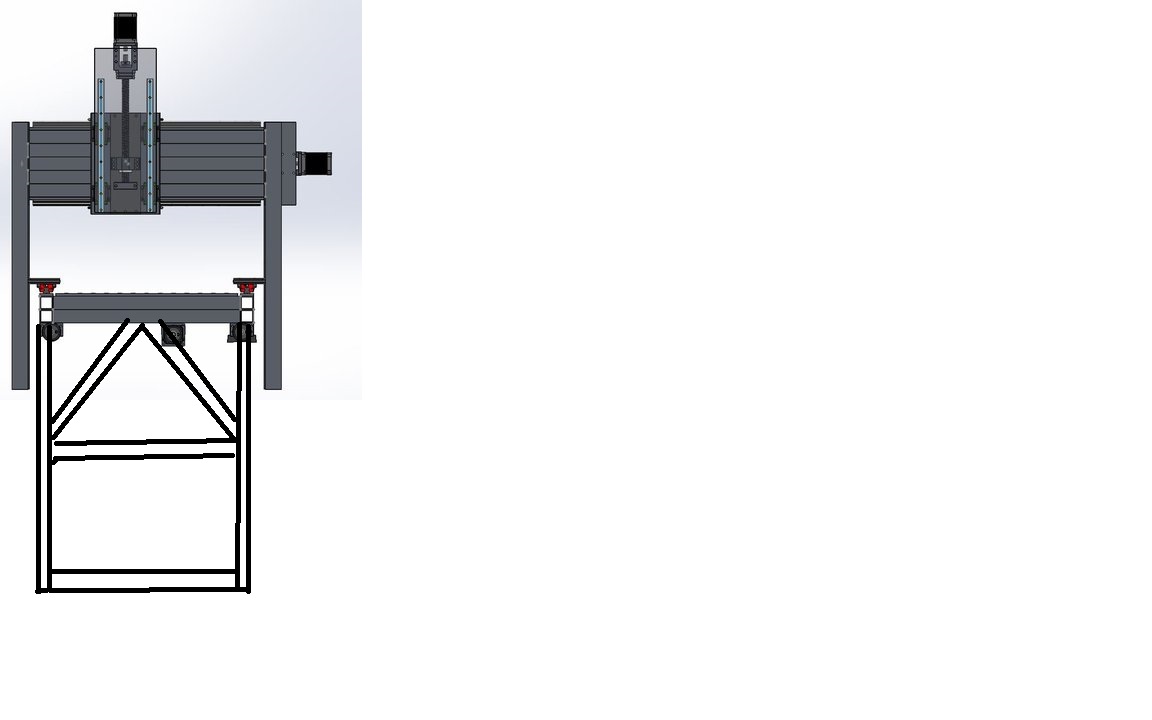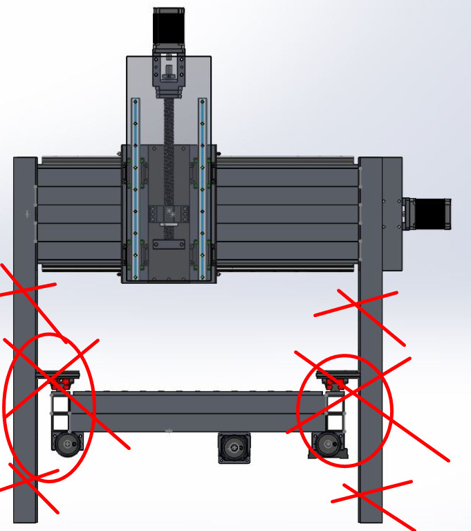Ty jekly co trčej dolů jsou zbytečně dlouhý, ale NESLOUŽÍ jako nosná konstrukce stolu (možná toho si se lekl že to tak vypadá?) je to normální portálka. Osa X - stůl - je pevná, jezdá portál. samotný rám stolu bude chycen na ocelové konstrukci jak v rozích, tak uprostřed (proto jsem zrušil to spojovaci rameno, při dvou šroubech mi přišlo vhodnější radši podepřít stůl uprostřed, rameno se samozdřejmě může použít, pokud nosnost a tuhost samotného stolu bude dostačující.