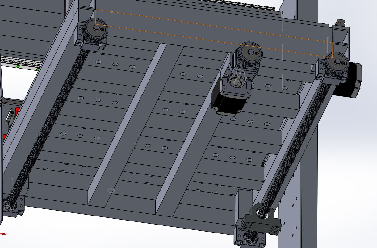 Proč na Z ose zvedáš domky, šroub, držák motoru a motor? Vždyť to je zbytečná váha. Dej uchycení na portál Y a zvedej jen matku, celé to otoč. Klidně motor mimo osu šroubu a řemínek.