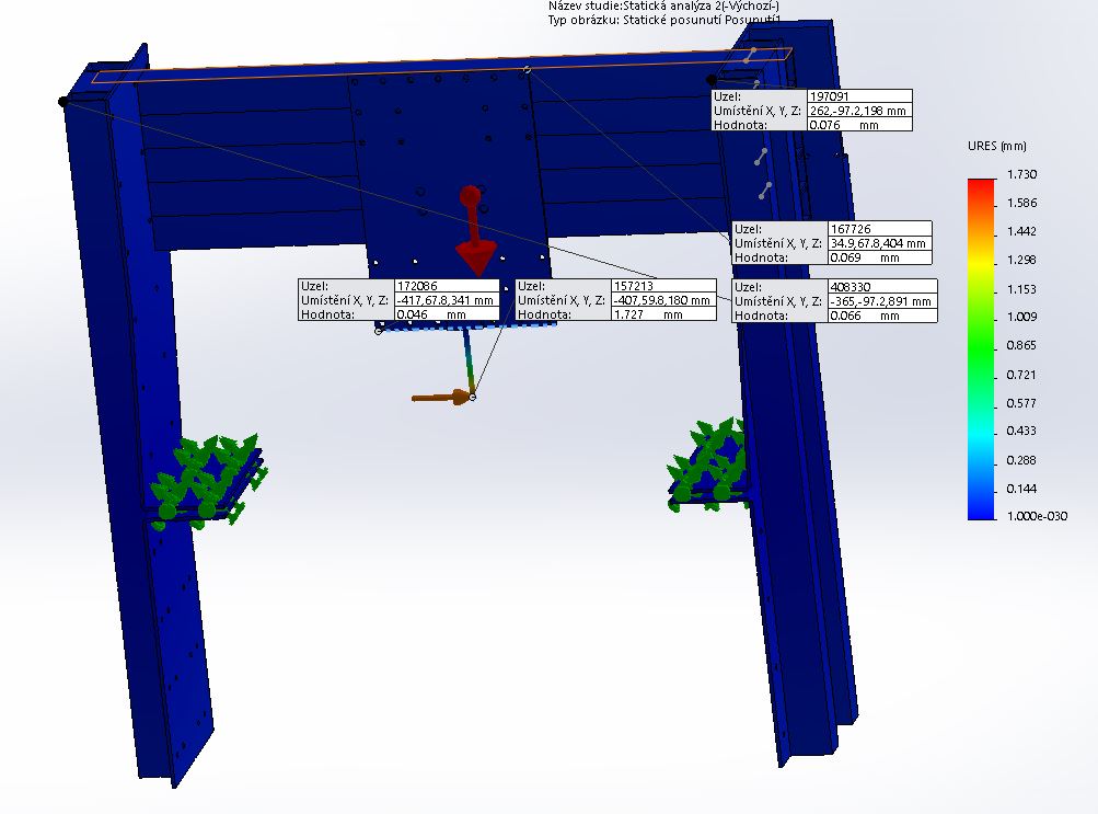 Netroufám si říct, jestli to dělám dobře, ale pokud vemu ten můj návrh s bočnicema s profilama a na "frézu" zatlačím 200N do strany, tak sou na tom sondy takhle: