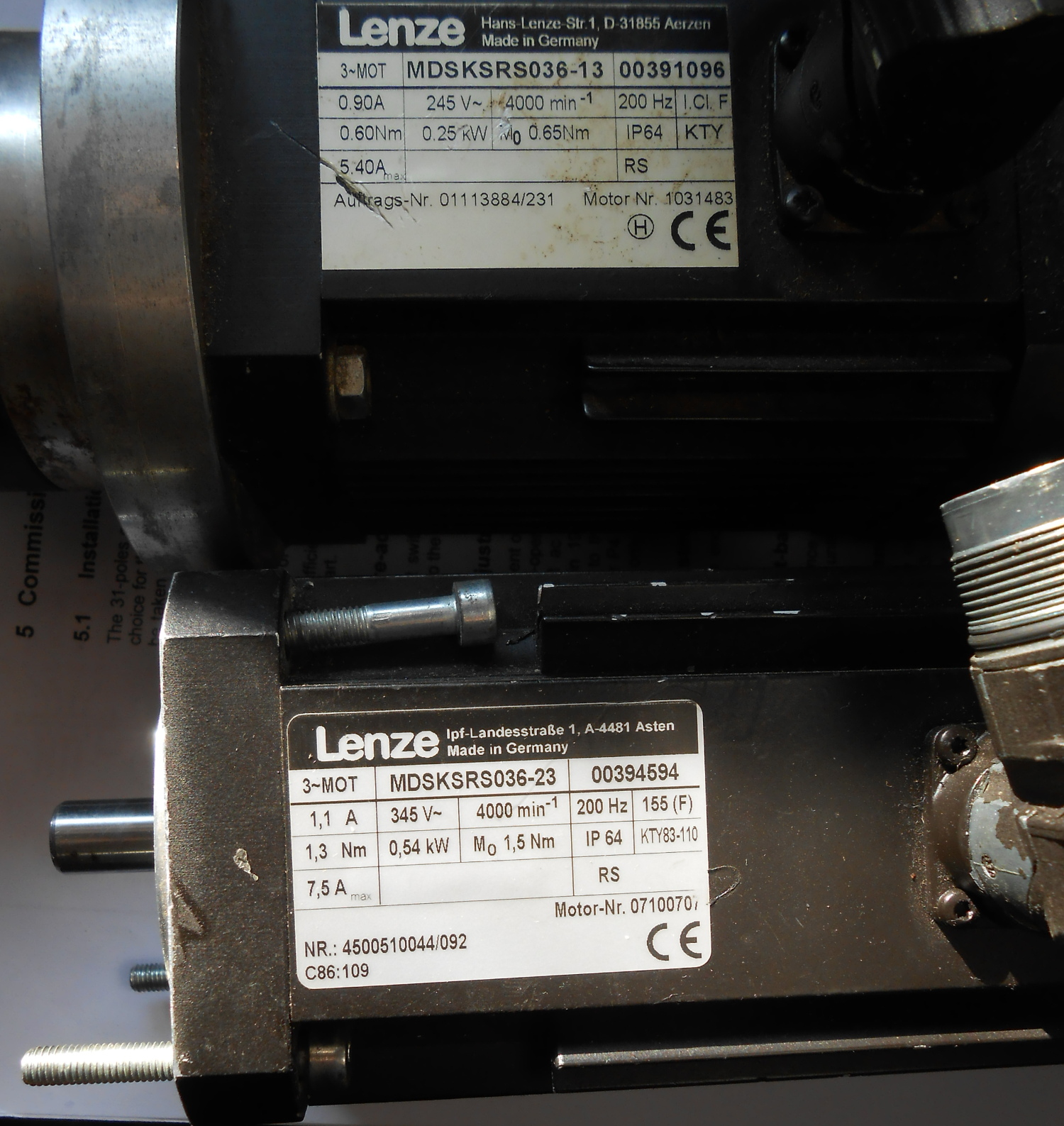 Dva servomotory MDSKS RS parametry motorů viz štítek jsou synchronní s resolverem a snímačem teploty vinuti,