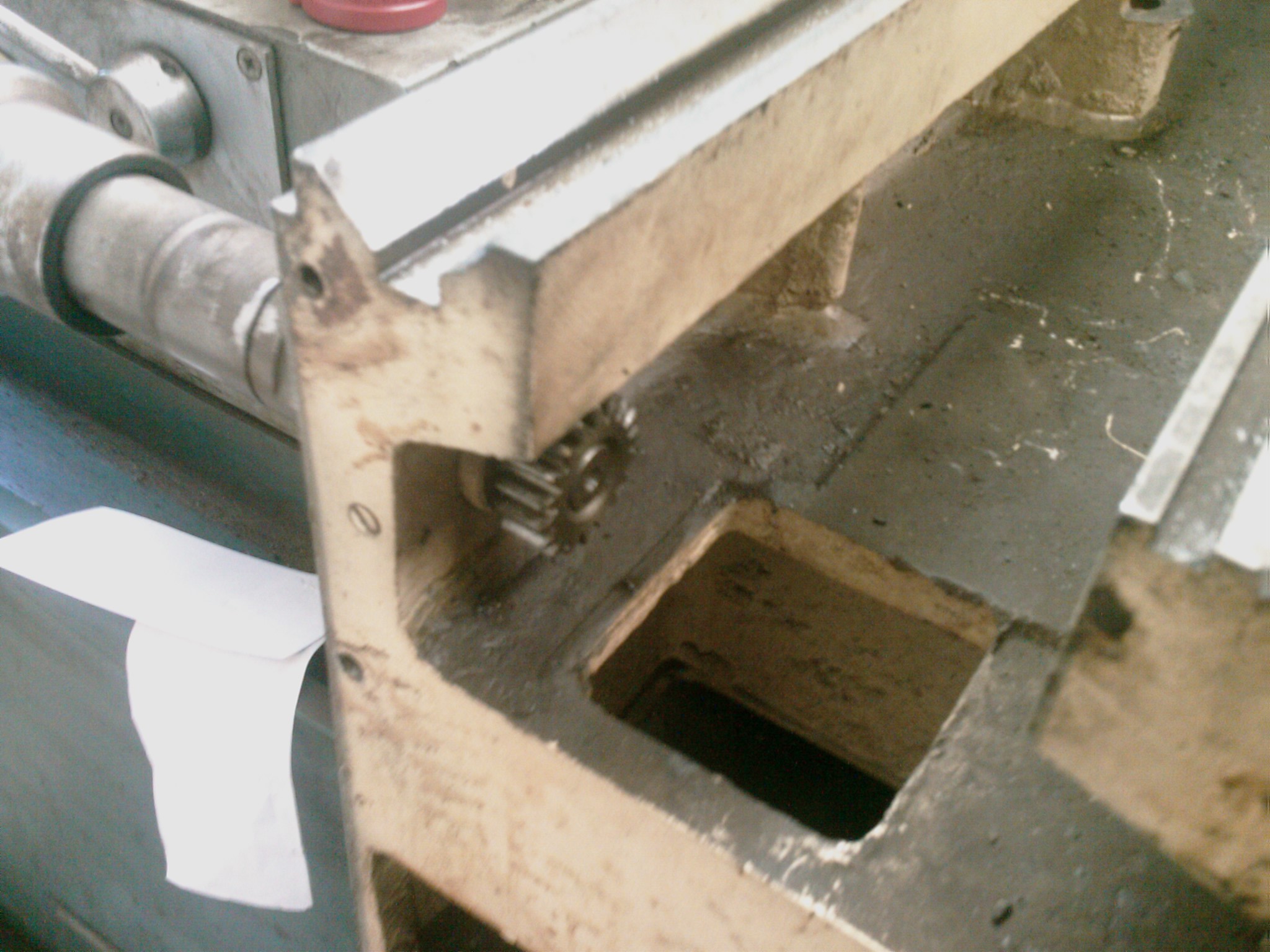 Jedině by byla možnost motor vystrčit na bok ven, ale i tam není moc místa (stůl má pak takovou plechovou zarážku aby nesjel dolů, co by tam vadila, přičemž v krajní poloze najede až úplně ke kraji toho prismatického vedení že tam není žádná mezera). Jedinou šanci tedy vidím připojit to nějak ze zadu z venčí přes levou kliku. Tu teprve budu sundávat a rozebírat kvůli čištění, tak uvidím jak je to konkrétně dělané a jak by se tam dala nějaká řemenice přidat.